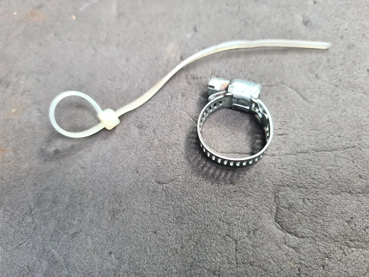 So hab ich zwar den Straps entfernen können, jedoch nach dem Zusammenstecken und Ausrichten der Verbindung keine Möglichkeit gefunden dies zusätzlich zu sichern. Angedacht war, statt der eher kontraproduktiven Strapse, eine passende Schlauchschelle. Alles gereinigt und wieder ordentlich verkleidet und nun abwarten, wie lange das so hält.