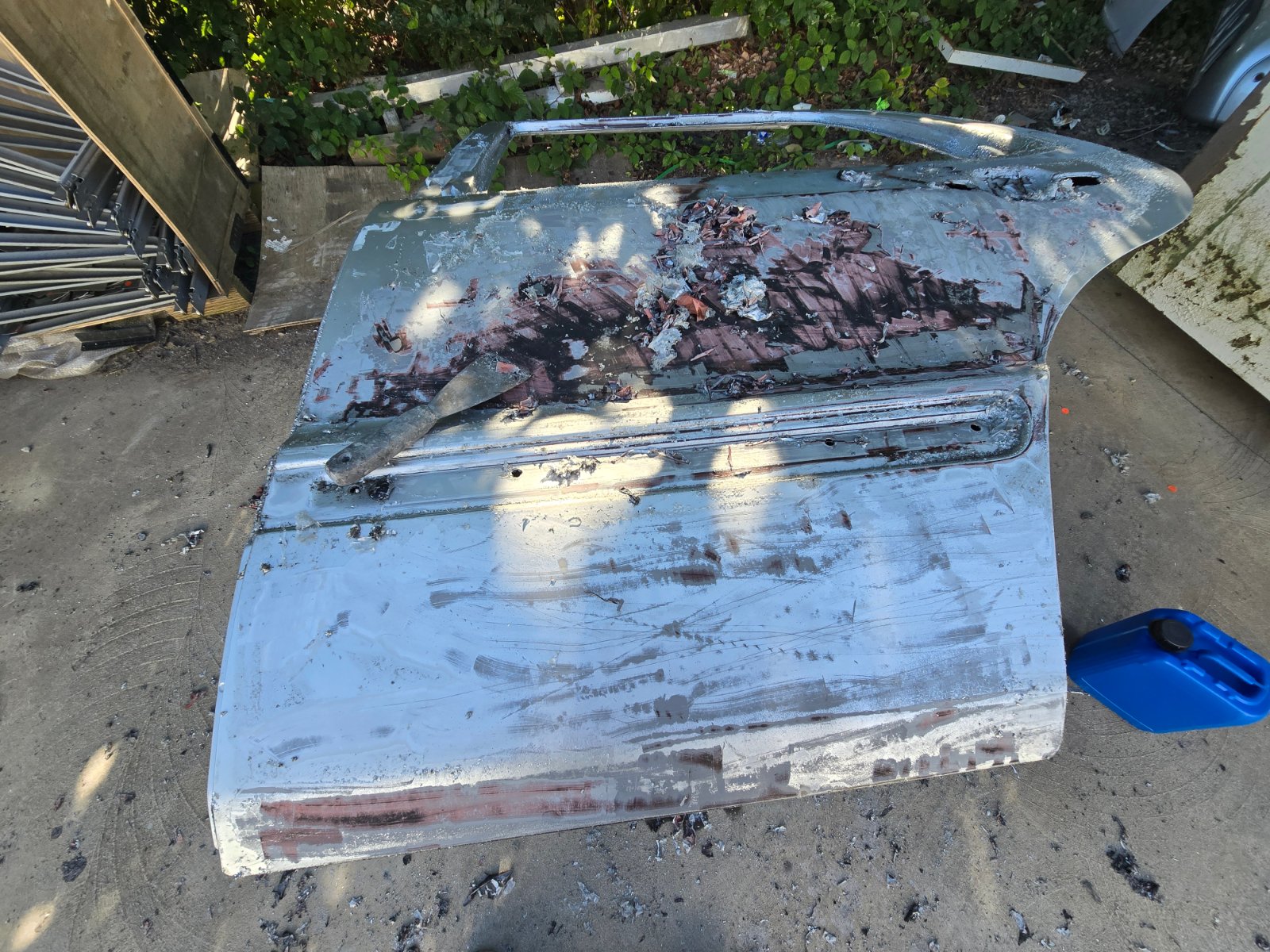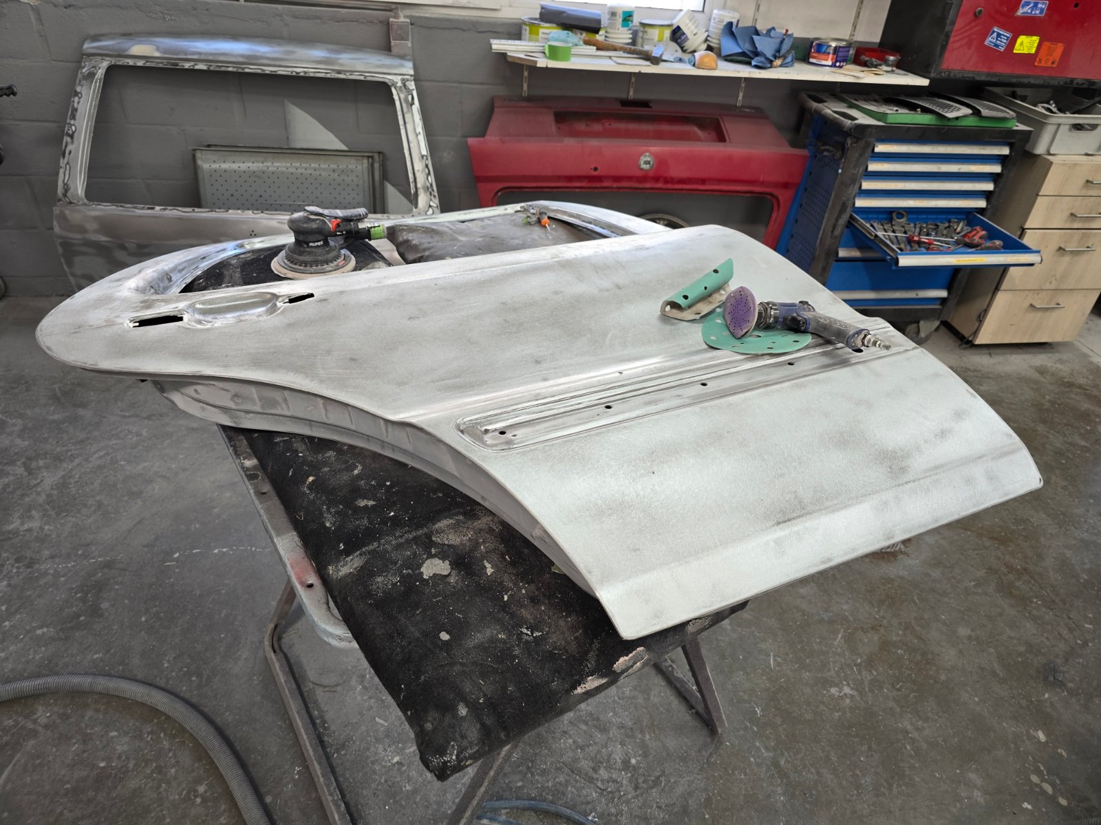 Dieser wird die Montagearbeiten und Vorarbeiten auch hauptsächlich durchführen. Die Türen müssen komplett inklusive der originalen MB-Grundierung von Farbe befreit werden, ohne allerdings die darunterliegende Zinkschicht abzutragen. Das ist ein ziemlich großer Aufwand.