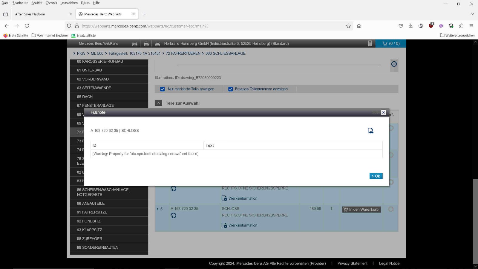 Wähle in Webparts bitte mein Fahrzeug und die Teilenummer A 163 310 04 46 aus und lass Dir dort die Werksinformationen dazu anzeigen und schreibe bitte, was Du da zu lesen bekommst. (Du kannst auch ziemlich beliebige andere Fahrzeuge und Teilenummern auswählen).
