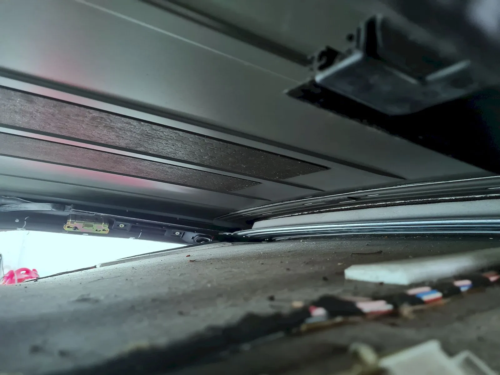 Aha, die Dämmatten oberhalb des Schiebedachs, hier wie neu. Bei meinem ML haben diese ihren Klebstoff, als der ML noch neu war, an heißen Tagen gern auf das Glasdach verteilt.