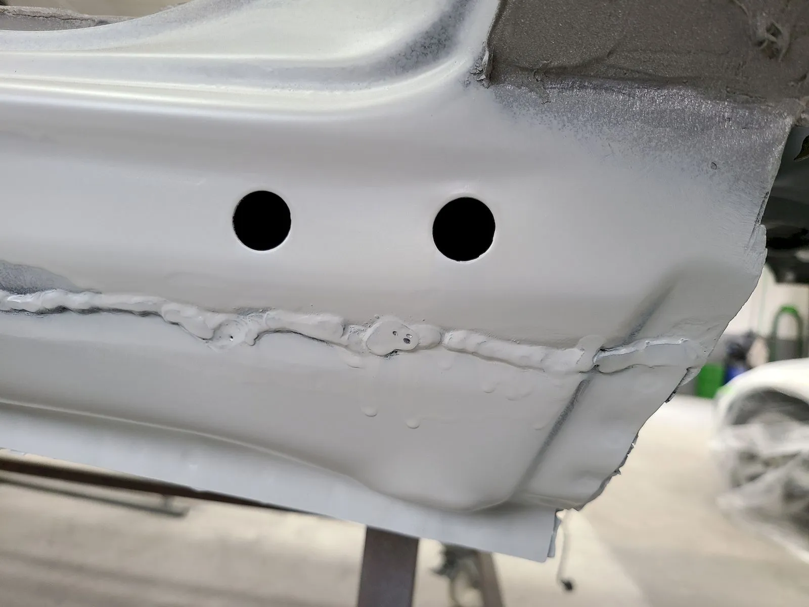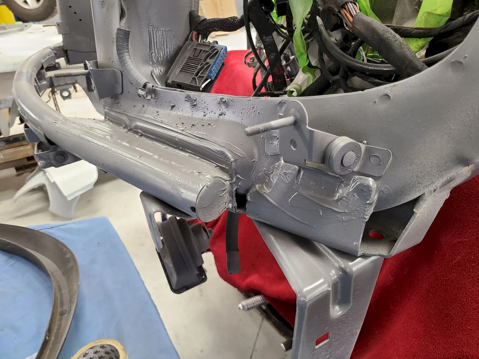 Die Karosserie ist jetzt soweit fertig, dass sie von außen grundiert werden kann. Das heißt, dass die Spachtel- und Schleifarbeiten beendet sind. Unten sind noch ein paar kleine Schweißarbeiten zu erledigen, wie z.B. das Anschweißen von ein paar Befestigungsbolzen für die Innenkotflügel. Danach erfolgt die Versiegelung und Lackierung von unten. Dann geht es oben weiter.