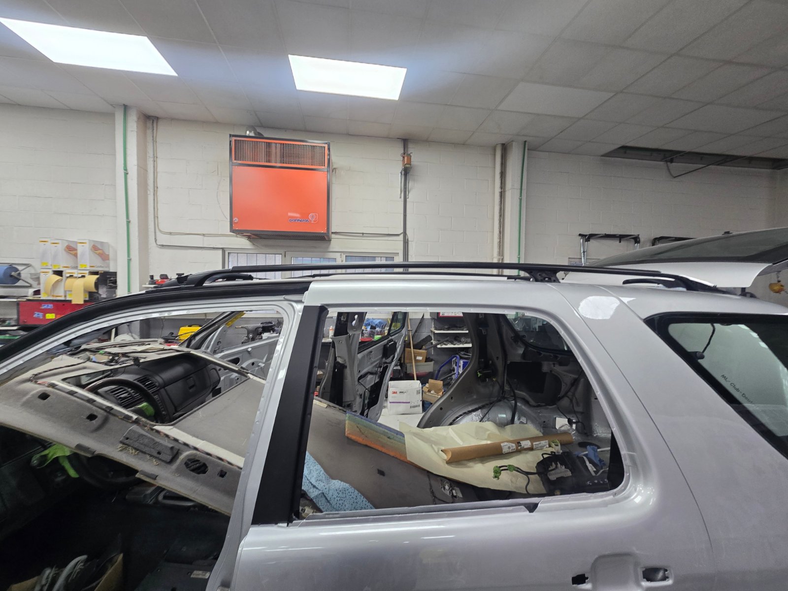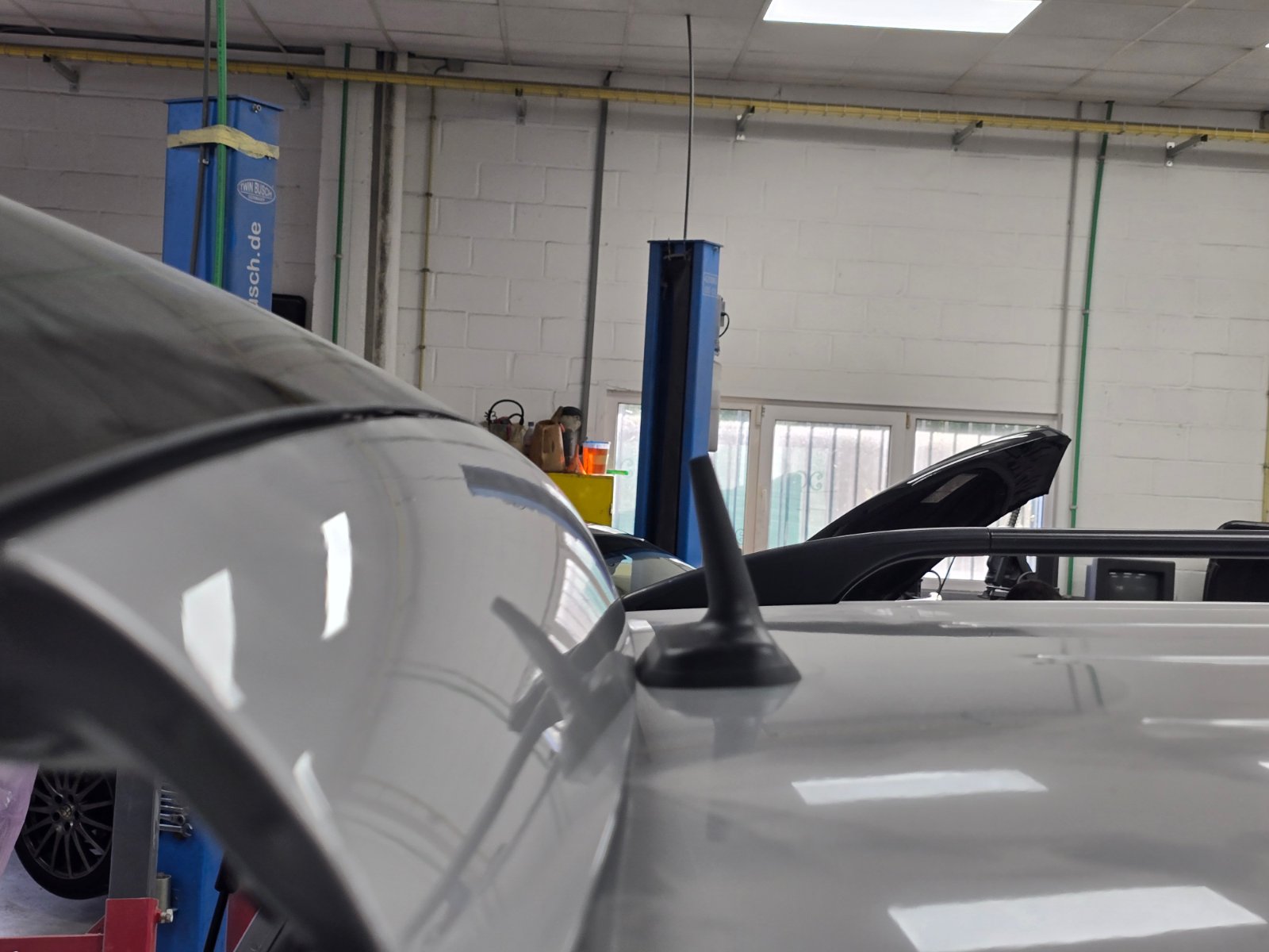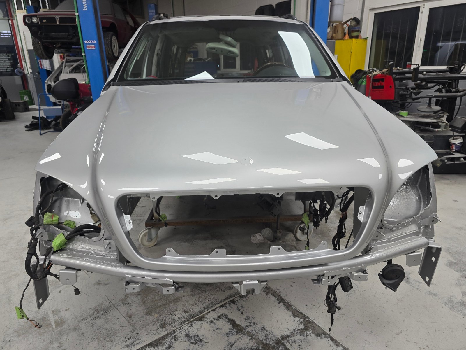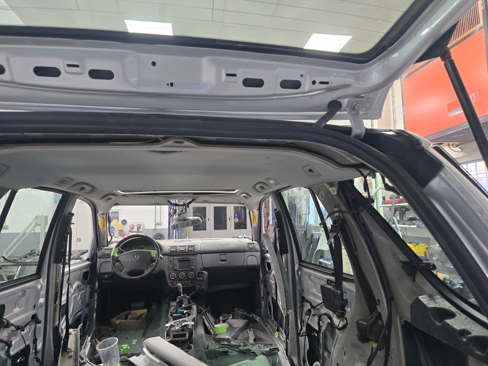 Jetzt geht es zügiger voran. Die Windschutzscheibe kann eingebaut werden, sie wird neu sein. Die hinteren Türen sind fertig und die vorderen sind morgen dran. Man kann auch gut sehen, warum man den Himmel nicht einfach aus dem Auto nehmen kann, denn da hängen Unmengen an Leitungen dran, was man ganz besonders vorne links in Höhe der A-Säule erkennen kann.