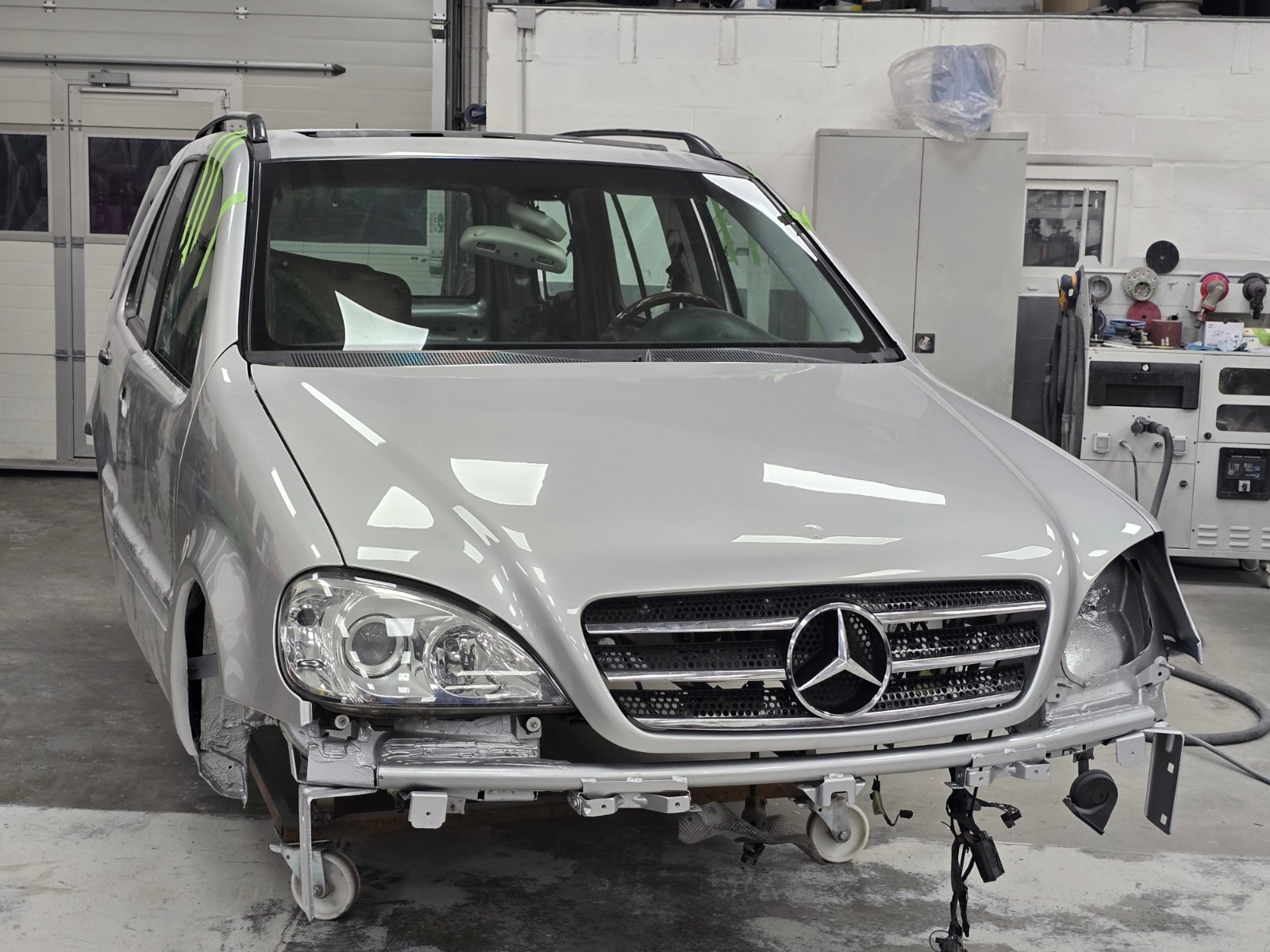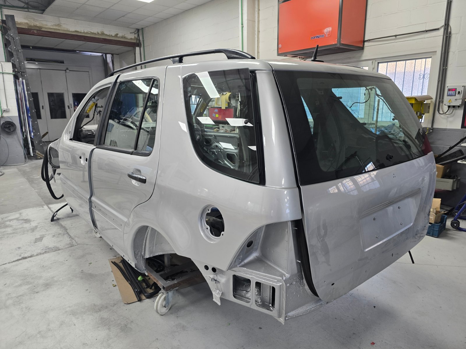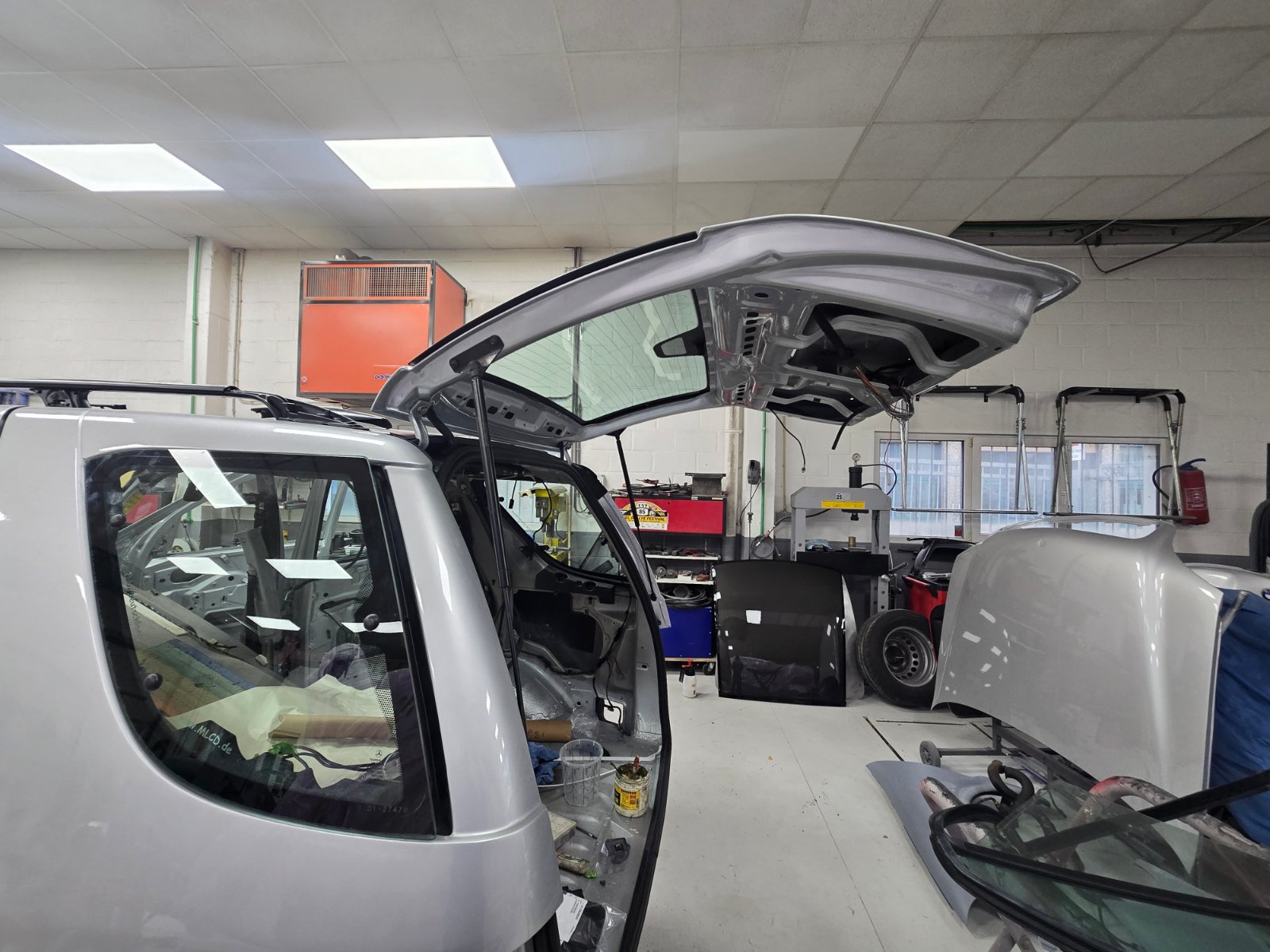 Unser ML hat inzwischen wieder Fortschritte gemacht. Die Heckklappe hat schon wieder eine Scheibe und heute wurden die hinteren elektrischen Ausstellfenster und die Dachrelings montiert sowie die hintere rechte Tür bereits zusammengebaut. Morgen geht es mit den restlichen Türen weiter. Anbei wieder einmal ein paar Fotos.