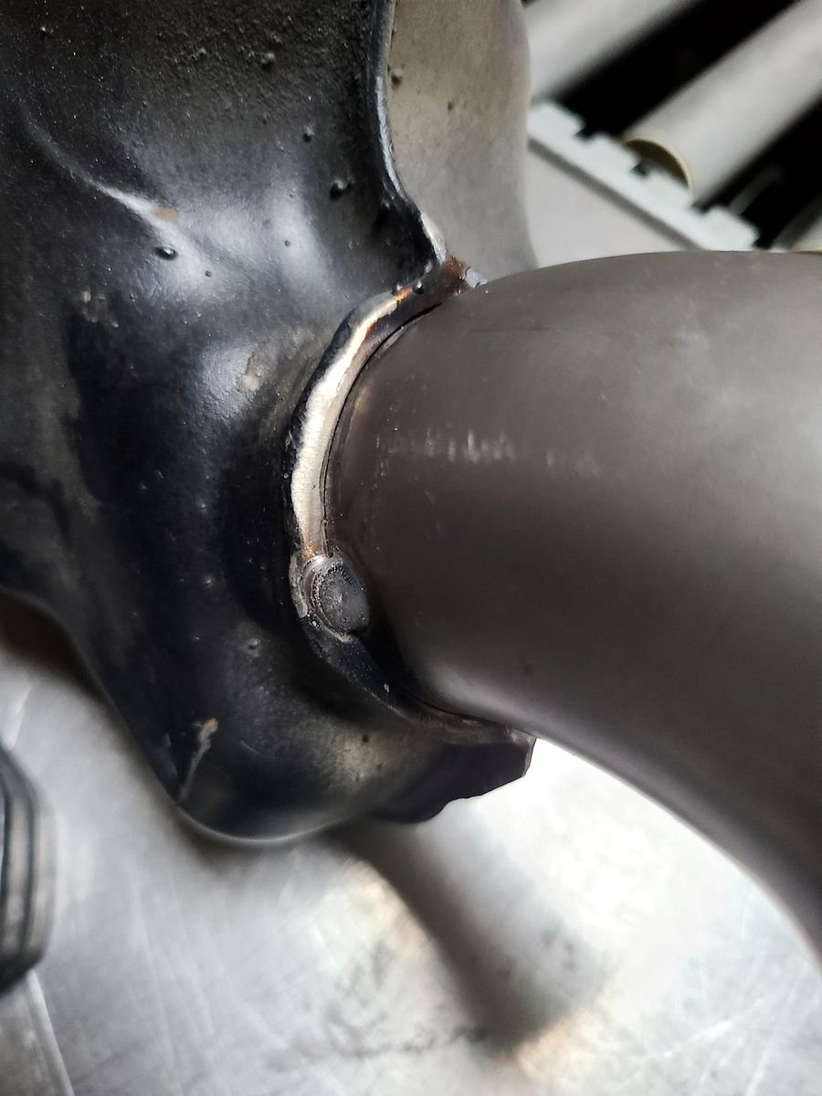 ja schon erwähnte, ist das Edelstahlrohr, das sich am Anfang des Endrohres befindet, nur geheftet worden. Der Grund liegt darin, dass Grywotz Dieter die Möglichkeit geben wollte, falls eventuell keine exakte Positionierung vorliegt, dieses bei der Anpassung am Fahrzeug ohne großen Aufwand noch zu ändern. Das ist auch der Grund dafür, dass Schalldämpfer und Endrohr noch nicht verbunden sind, denn erst am Fahrzeug, kann man die 100%-ige Ausrichtung sehen. Die Auspuffschellen werden auch noch durch solche aus Edelstahl ersetzt, die morgen geliefert werden sollen. Wie sieht das sonst aus, wenn da rostige Schellen an dem schönen Schalldämpfer sind?
