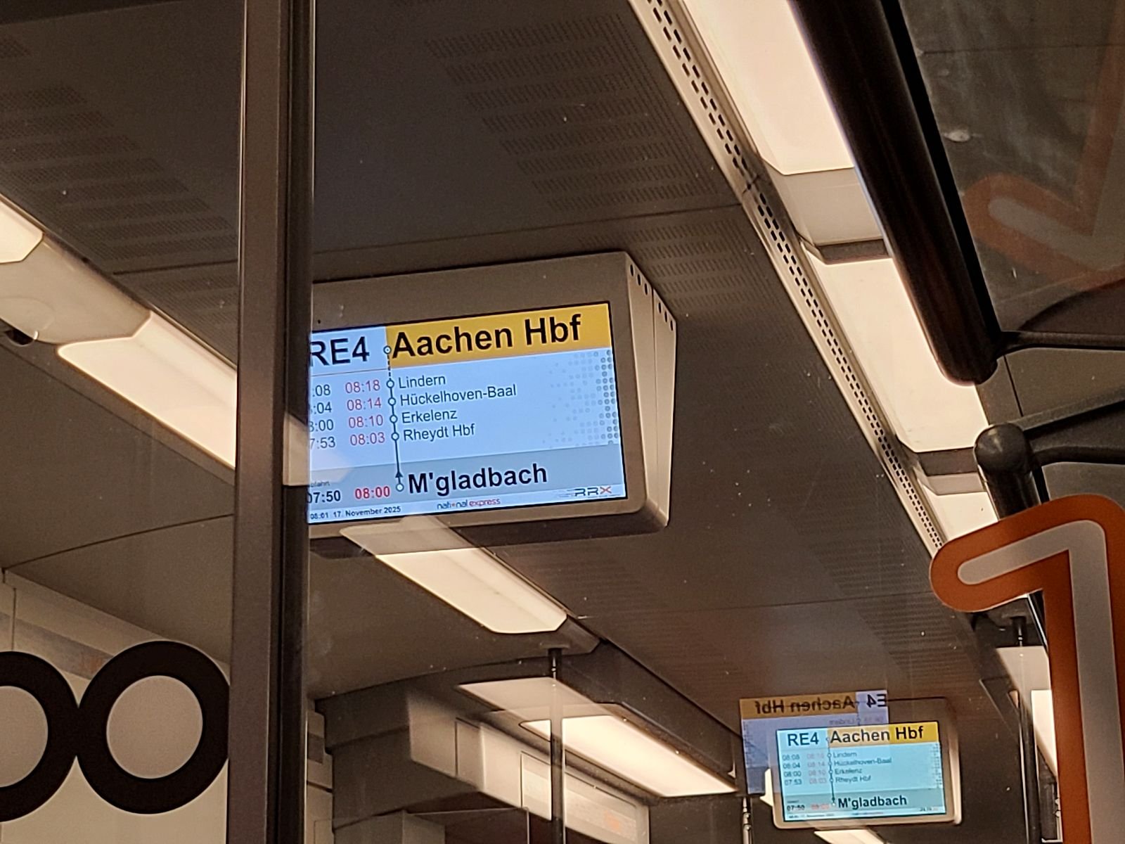 Manfreds Handy und die Blech-Else erzählten Unsinn, weswegen ich ganz kurzentschlossen umplante und den einfahrenden RE4 nahm. Der Zug war gut voll, nicht mehr angenehm, und der hatte ja für mich den Nachteil des zusätzlichen Umstiegs und der längeren Fahrt über DU Hbf.