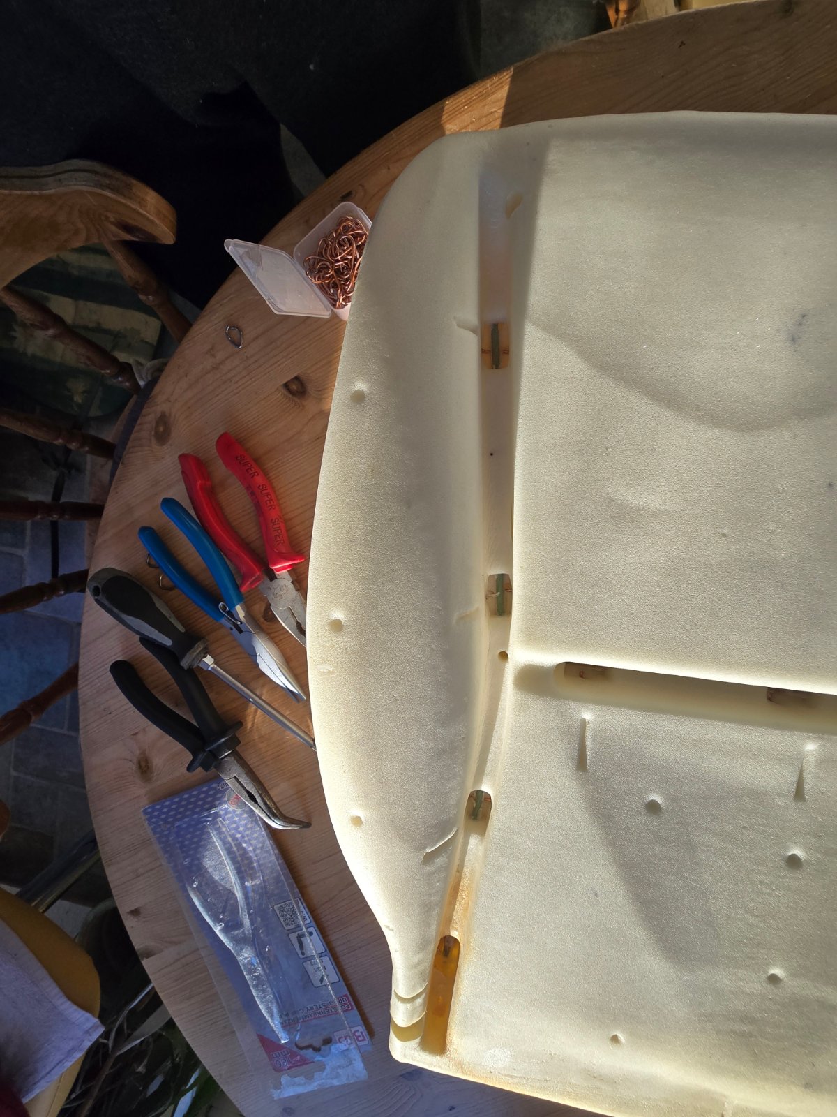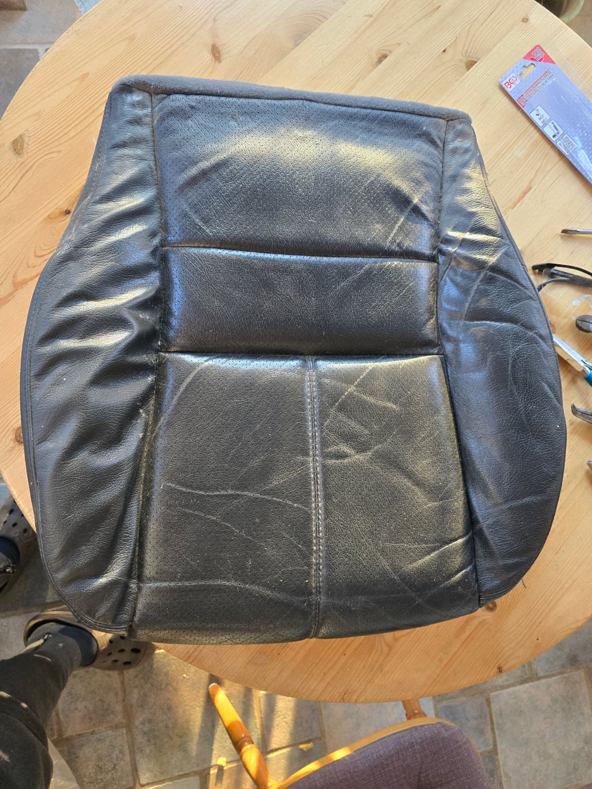 Seit mehr als einem Jahr steht schon der Fahrersitz unseres MLs im Flur, da dieser ein neues Sitzkissen und auch zwei neue Kunststoffverkleidungen erhalten soll. Das Sitzkissen lagert schon seit gut 10 Jahren bei mir, jetzt sollte es endlich verbaut werden. Die vordere sowie die linke Plastikverkleidung (die mit den Schaltern für die Sitzverstellung) warten auch schon lange auf Ersatz. Heute sollte das alles endlich werden, damit unser ML nicht noch darauf warten muss. Wie man den Sitzbezug erneuert, hatte ich ja bereits in einem DIY 2008 beschrieben. Die Arbeit ist dieselbe, daher beschränke ich mich auf die Fotos. Diesmal hatte ich allerdings eine spezielle Zange für die Befestigungsringe am Start, weil es sonst doch recht hakelig ist.