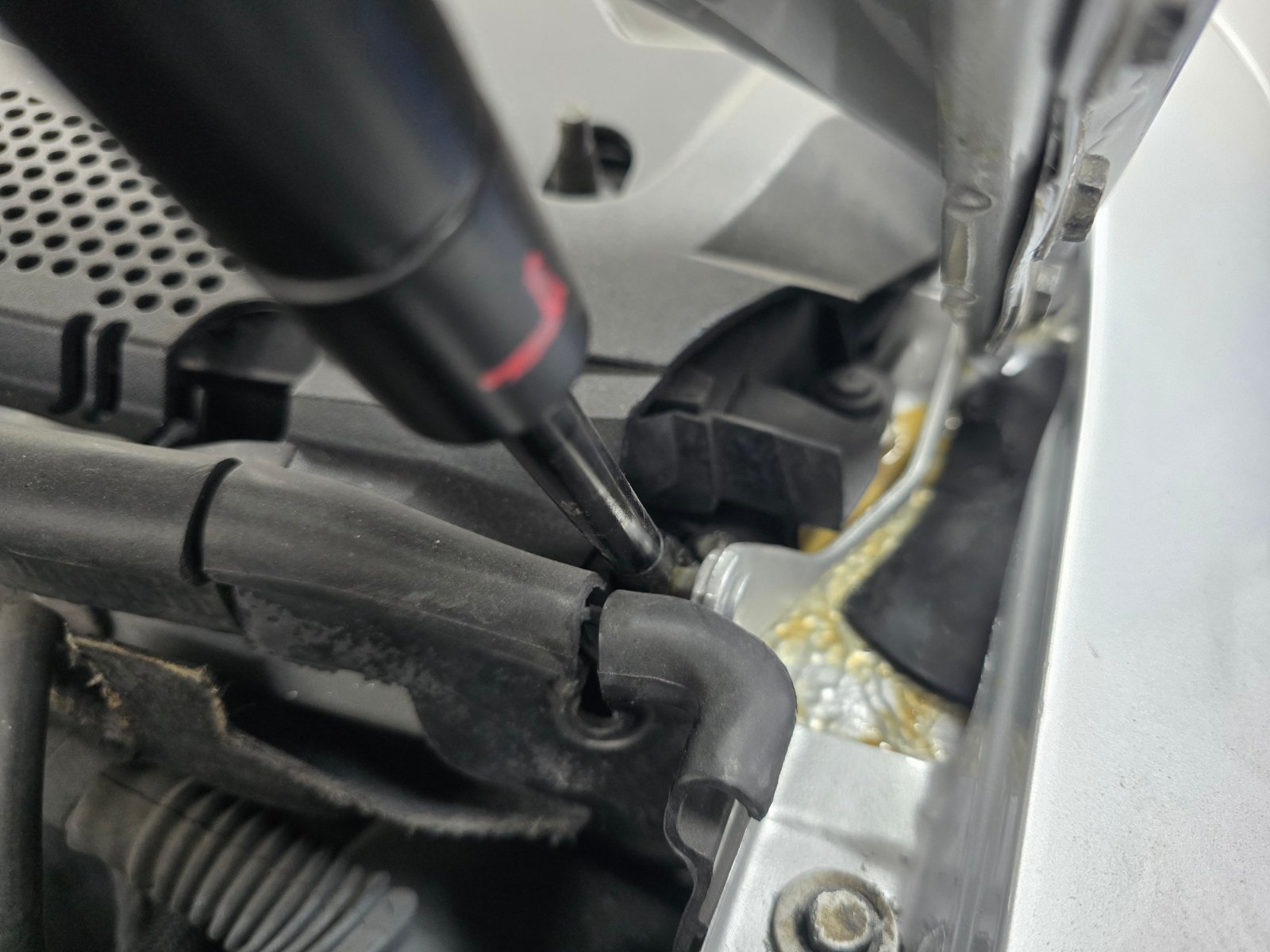 Und wieder ging es weiter: Heute wurden die Türzierleisten und die Schwellerverkleidungen montiert. Dabei fiel auf, dass leider noch ein paar Clips nicht mehr verwendbar waren und so müssen wir für die linke Seite noch auf deren Eintreffen warten. Außerdem sollte der Tankeinfüllstutzen wieder in seine Position kommen, was sich zunächst etwas schwierig gestaltete, was aber, wie es sich herausstellte, an einem defektem O-Ring lag, den wir dann erneuert hatten. Aber die Arbeit konnten wir dann heute nicht mehr beenden, da Dieter um 17:30Uhr einen Termin hatte. Der Stutzen wird an der Karosserie über eine Kunststoff-Gummikonstruktion gehalten, die mittels eines Bajonettverschlusses miteinander verbunden sind. Fortsetzung folgt.