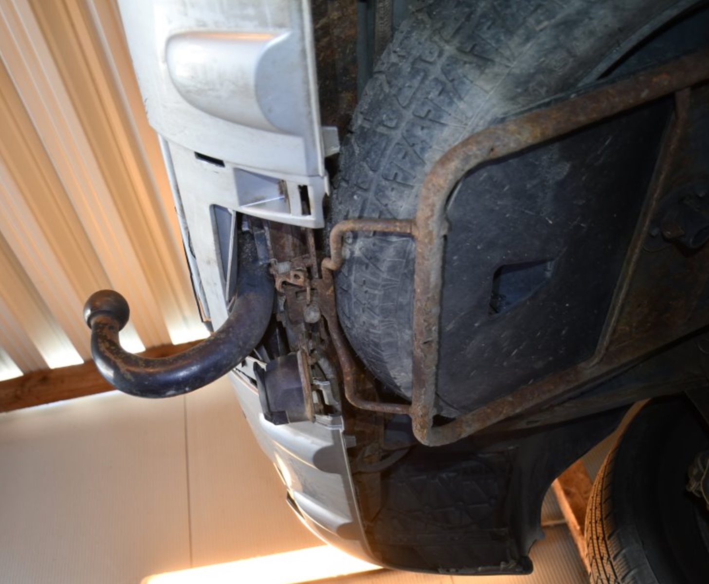 Der Stoßfänger ist mehrere Male gebrochen und der darunterliegende, durchgerostete Querholm, an dem die AHK montiert ist, ist eingedrückt.