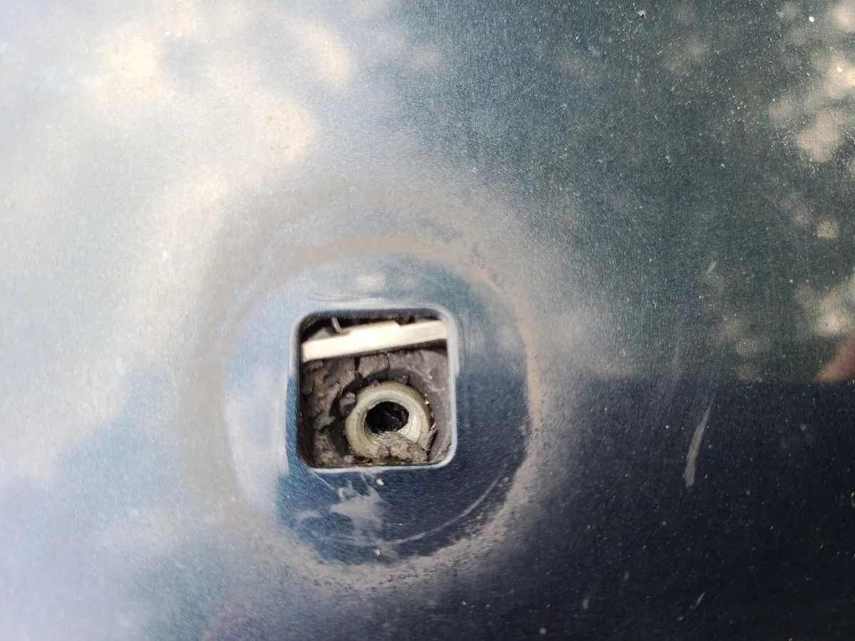Der weggebröselte quadratische Teil der Gummidichtung um die mittlere Rundung, also außen, war wohl ein Teil des noch im Loch, innen, sichtbaren schwarzen Dichtgummis.