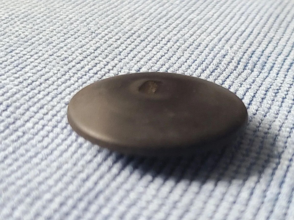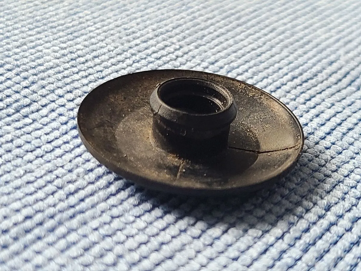 Die porös gewordenen Gummidichtung hatte die schwarze Kunststoffabdeckung leicht nach oben gedrückt. Und schon bei leichter Berührung hatte ich das Ding, groß wie ein 2,-€-Stück, in der Hand und die Gummidichtung zerfiel vollends.