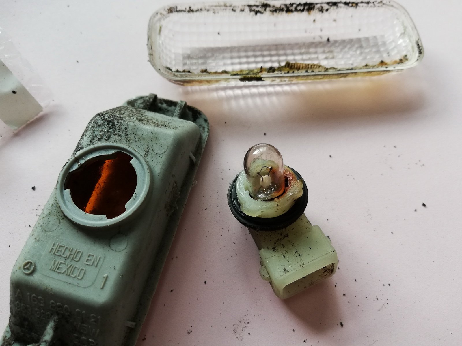 Hier mal zur letzten Ansicht und zum Erkenntnisgewinn die zerlegte (und nun entsorgte) Leuchte der Fahrerseite. 22 Jahre alt und mindestens 20 davon ununterbrochen auf der Straße.Theoretisch kann man die Lampe, welche hier ja schon ziemlich schwarz ist, tauschen. Mit etwas Gewalt und dem Risiko, daß die Leuchte oder zumindest die Dichtung beschädigt werden.