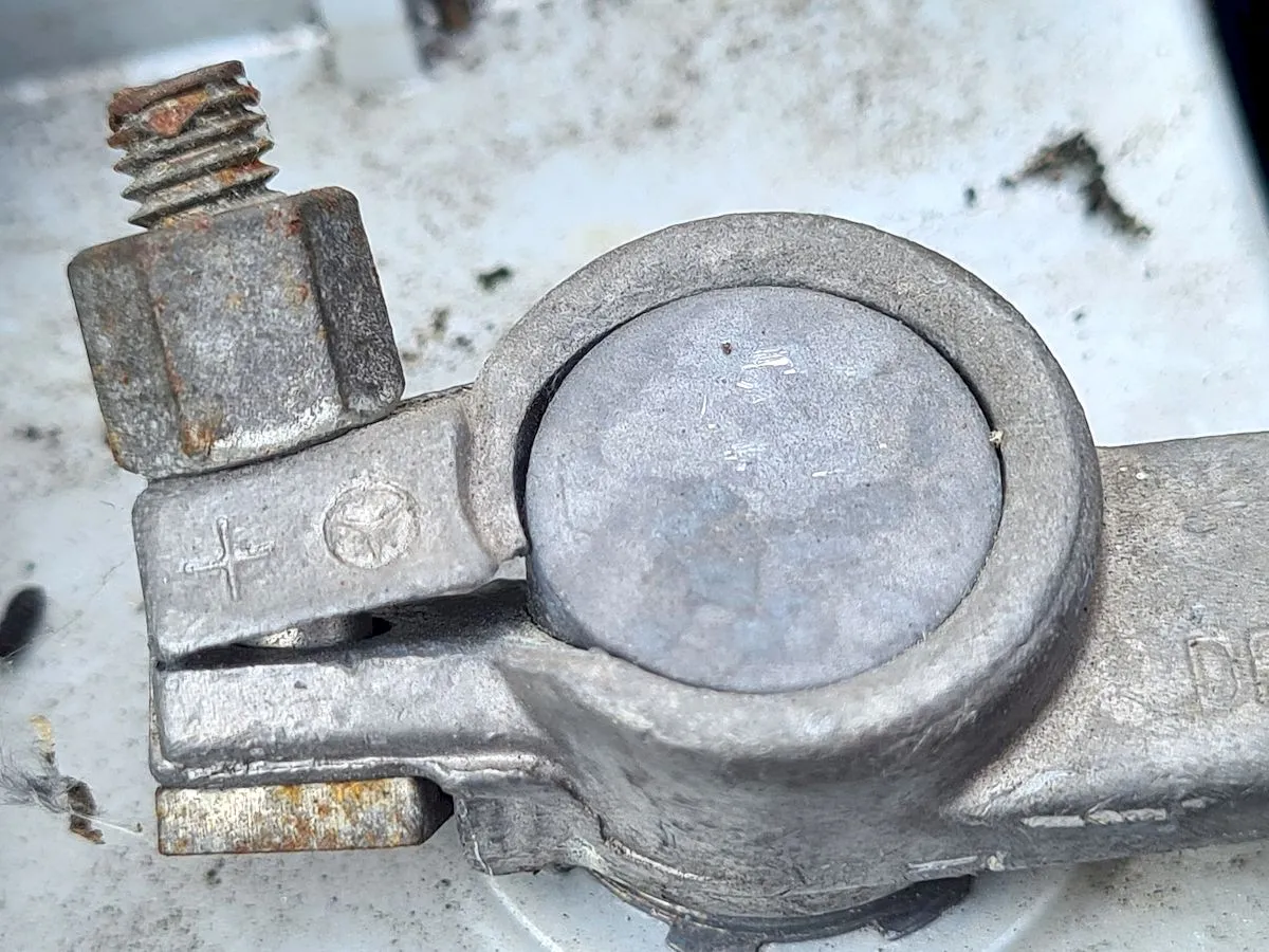 Vorab die Polklemmen und deren Schrauben gerichtet. Und, nein, ich hab wieder ganz bewußt kein Polfett verwendet. Vorab hatte ich darüber nochmal nachgelesen, und zwar nicht bei denen die das Zeug teuer verkaufen wollen. Korrosion gab es bei meinen Autos an den Polklemmen noch nie. Und da das Zeugs keine andere Aufgabe hat als diese zu verhindern brauch ich das da nicht. Zumal es nichtleitend ist und sogar den Übergangswiderstand zwischen Batteriepol und dessen Klemme erhöhen könnte.