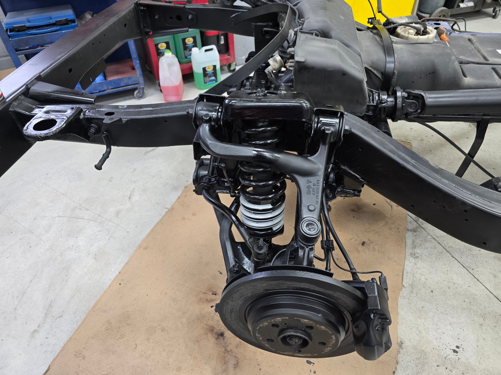Es ging wieder an der Hinterachse mit Schweißarbeiten weiter, wovon ich auch zwei Fotos einstelle. Jetzt ist sie komplett fertig, denn Dieter Kurabi war heute noch bei mir zu Hause, um mir zu sagen, dass auch die Federn der hinteren Federbeine erneuert sind, was er heute extra am Samstag noch gemacht hat. Er hofft darauf, nächste Woche die Karosserie wieder mit dem Fahrgestell verbinden zu können. Traurig nur, dass schon wieder eine Feder gebrochen war, denn die Federbeine hatte ich original bei Mercedes ersetzen lassen und sie haben nur 3 Jahre und knapp 60.000km gehalten. Mercedes hat immer nur komplette Federbeine geliefert, inzwischen sind diese nicht mehr lieferbar. So habe ich zwei einzelne Federn von Bilstein als Originalersatz bei kfzteile24 gekauft. Diese passten auch präzise. Jetzt geht es mit Durchrostungen an der Vorderachsaufnahme weiter, die aber eher gering ausfallen, soweit man das im zusammengebauten Zustand sehen kann. Wo gerade alles auseinander ist, soll Dieter auch noch unter die Faltenbälge der Lenkung schauen, ob diese dicht ist, wenn nicht, wird sie von einem Dieter bekannten Spezialisten überholt werden.