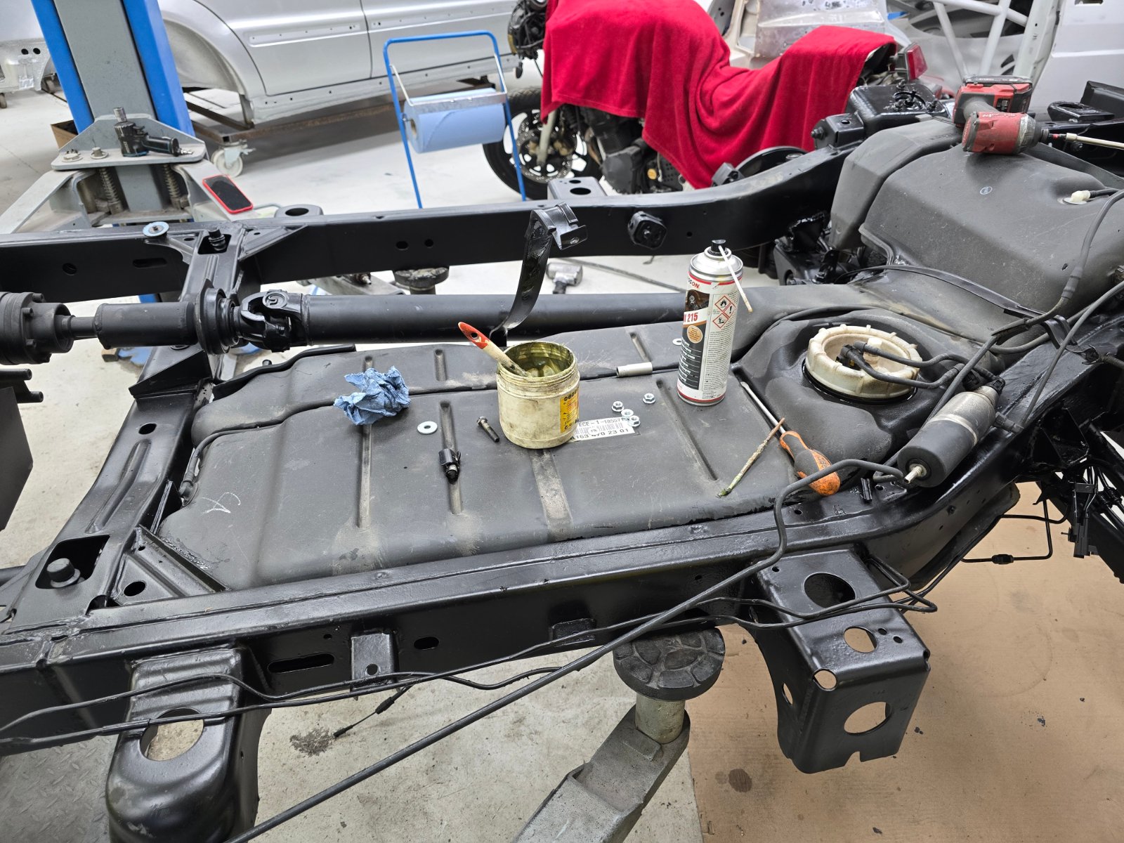 Heute gab es wieder einen Fortschritt: Der Tank ist eingebaut! Sämtliche Schraubengewinde werden beim Einbau eingefettet aud alle Auflageflächen, auch die der vier Tankhaltebänder, mit Wachs eingesprüht. Anbei ein Haufen Fotos! Viel Spaß dabei!
