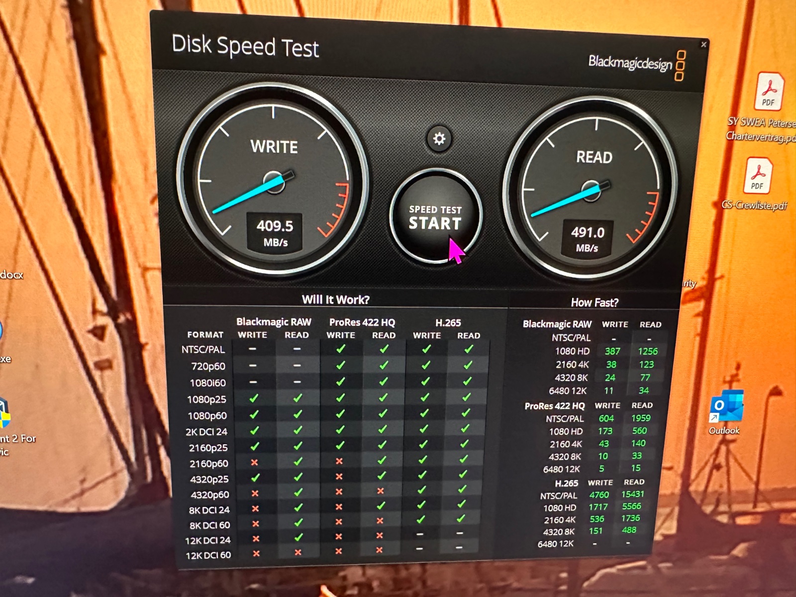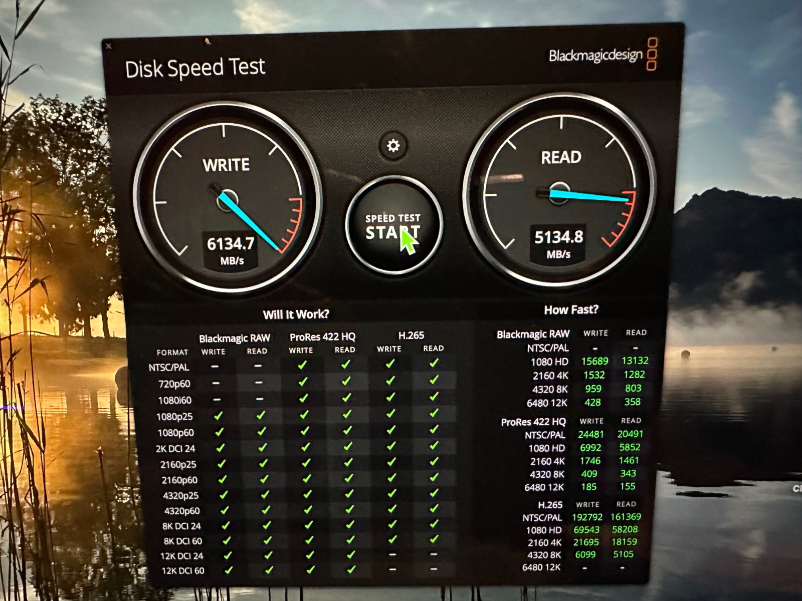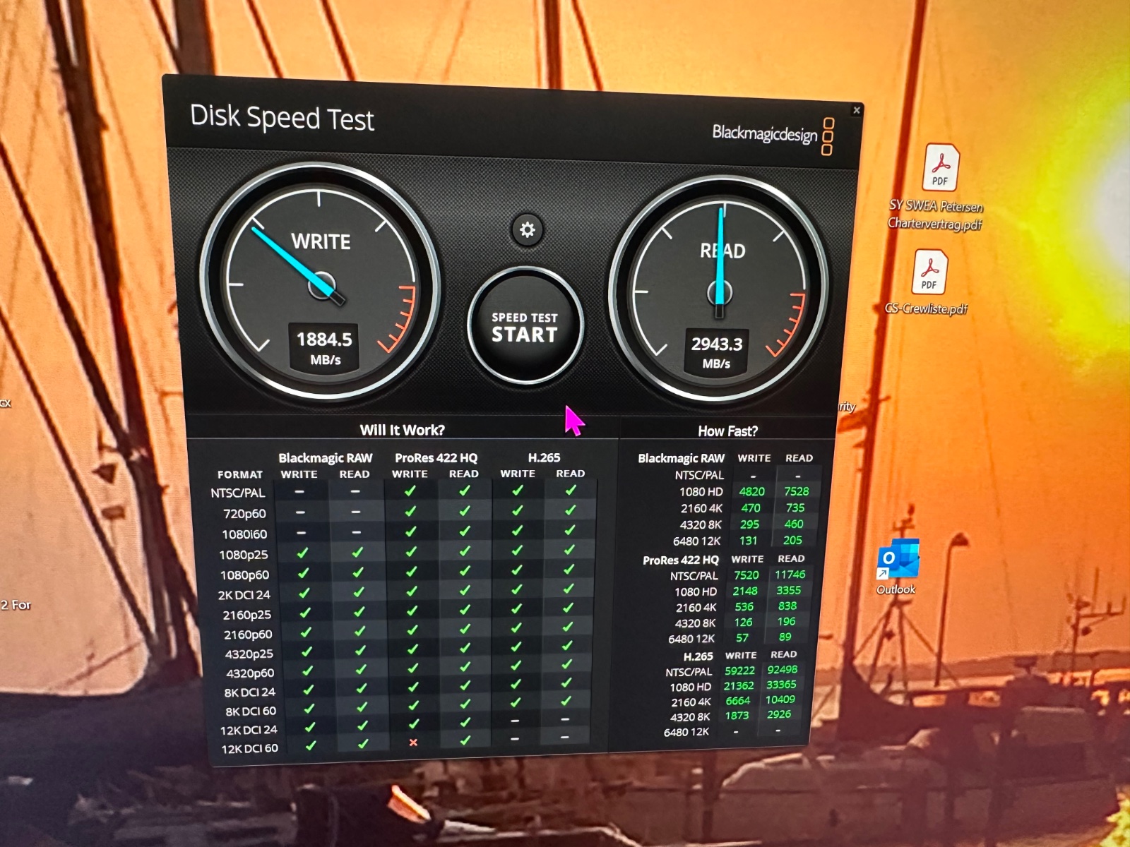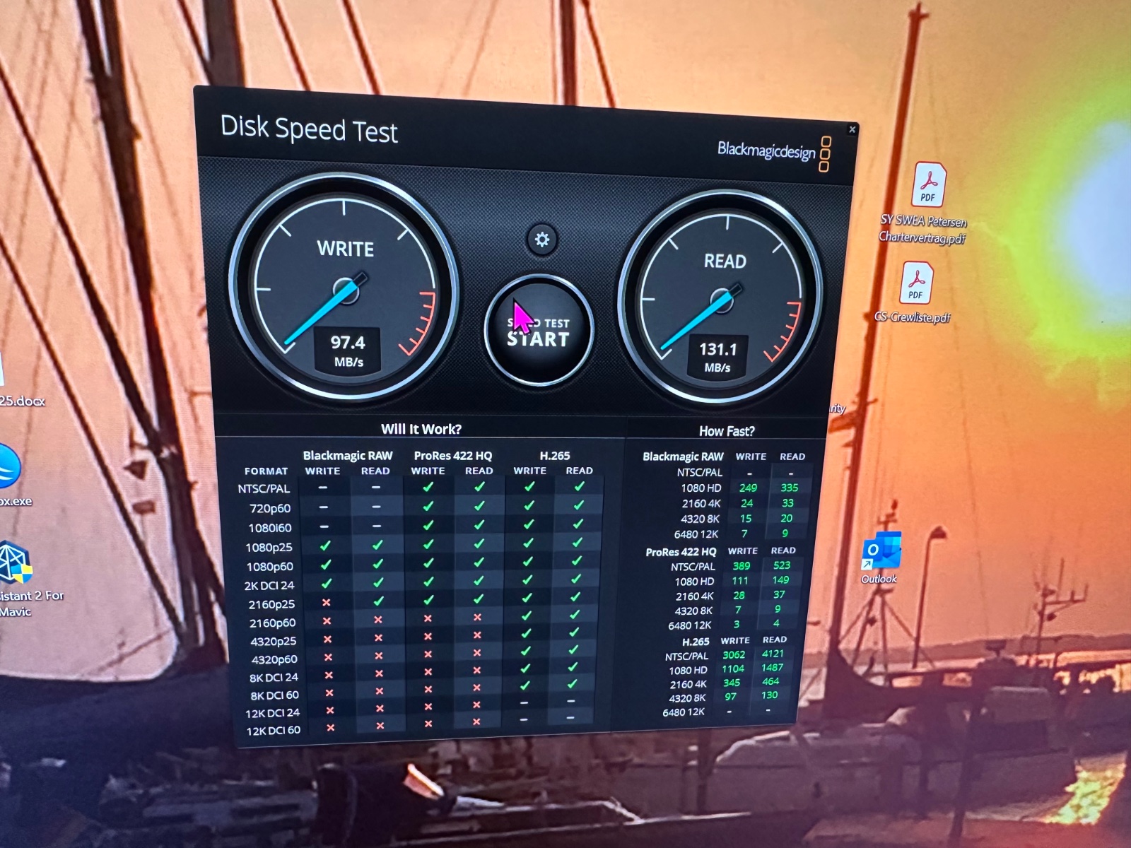 Hier mal der Vergleich der Geschwindigkeiten, gemessen mit dem Disk Speed Test von Blackmagicdesign, der Produzent von DaVinciResolve. Dieses Programm kann kostenfrei genutzt werden.