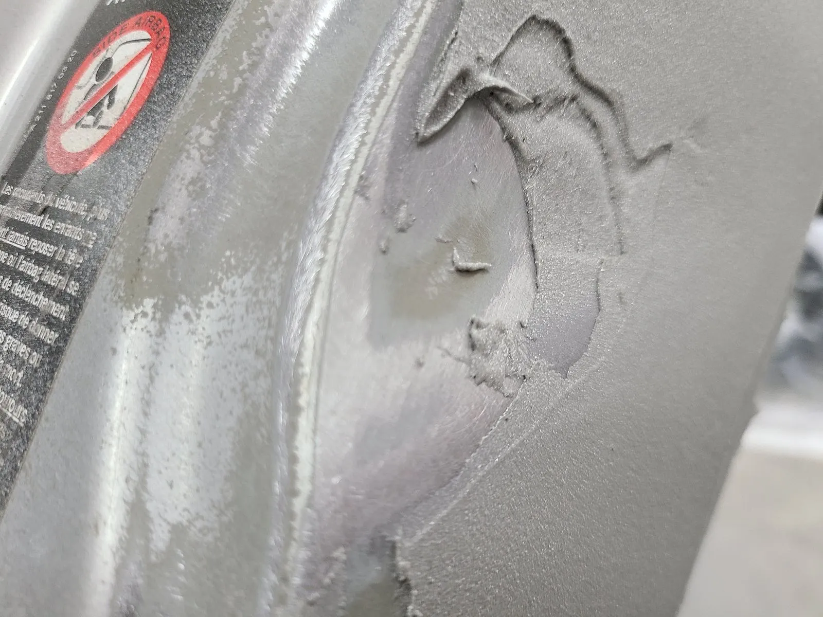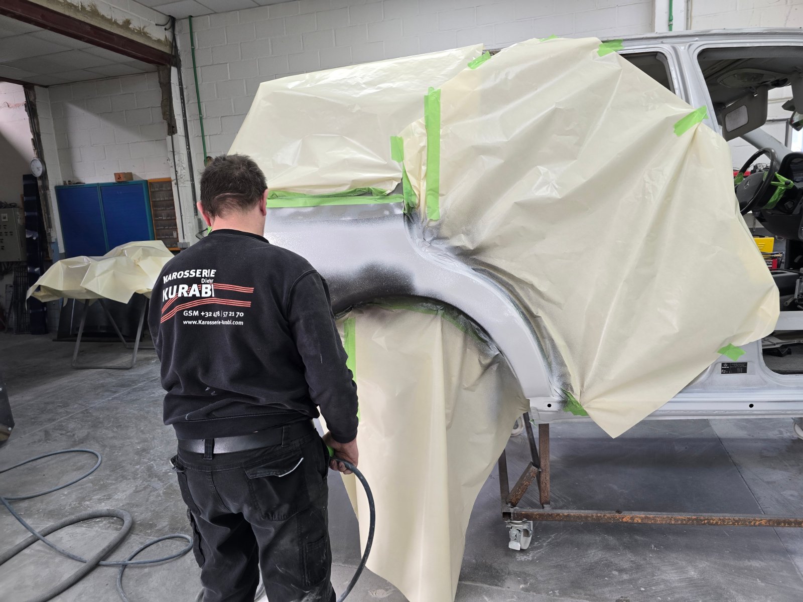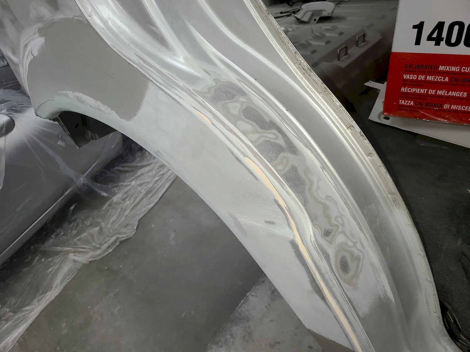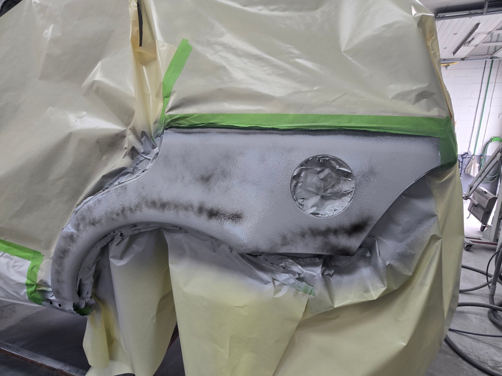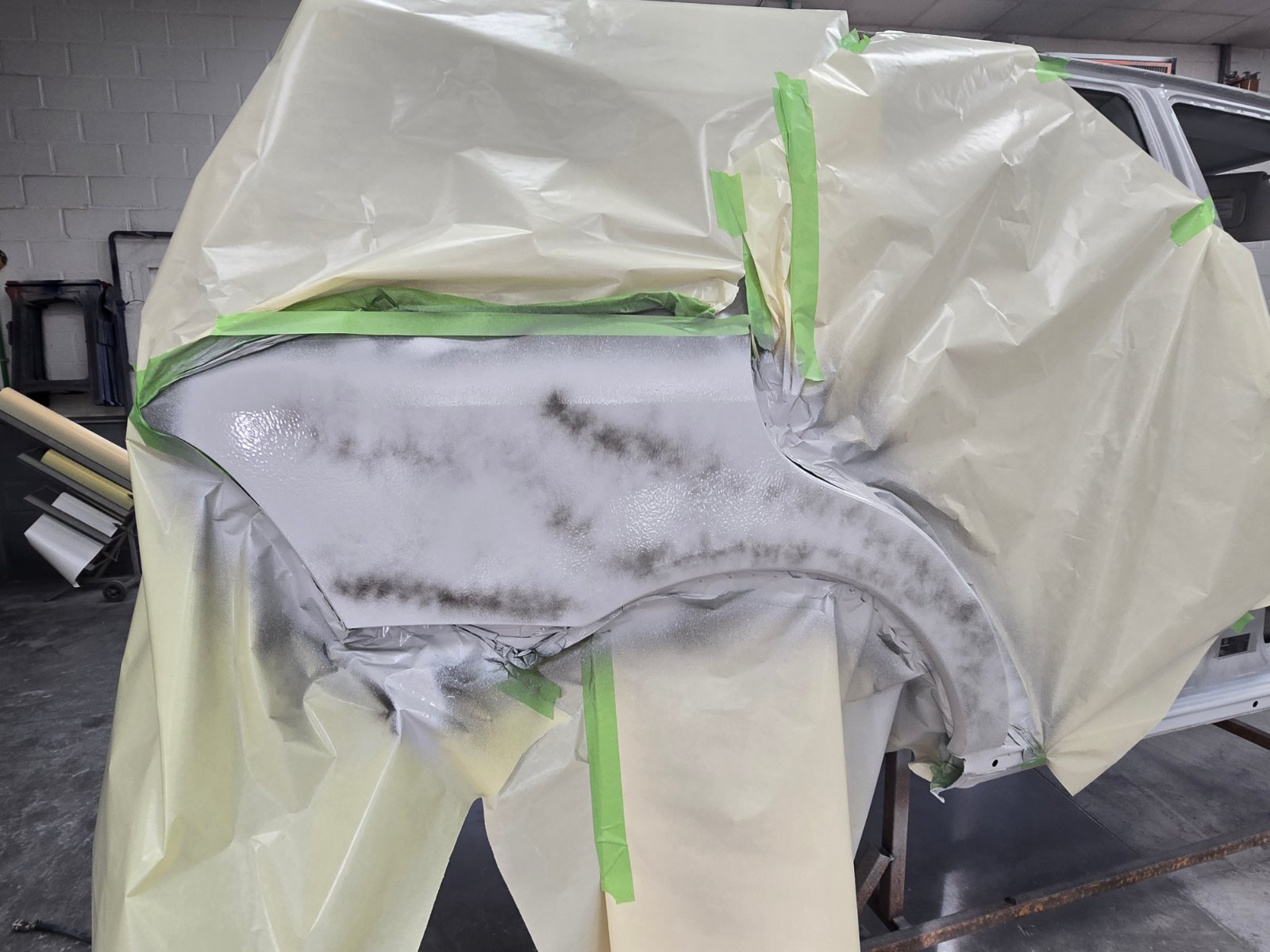 Tatsächlich war ich heute bei unserem ML. Gerade eben, als ich ankam, war Dieter Kurabi damit beschäftigt, die hinteren Kotflügel, die ja teilweise ersetzt, dann die Nähte verzinnt und gespachtelt und mit Epoxy grundiert wurden, mit Spritzspachtel versehen wurden. Der kann relativ dick aufgetragen werden und bildet eine sehr schöne Basis, für die nachfolgende Lackierung, denn dieser füllt die letzten kleinsten Unebenheiten und Kratzer.