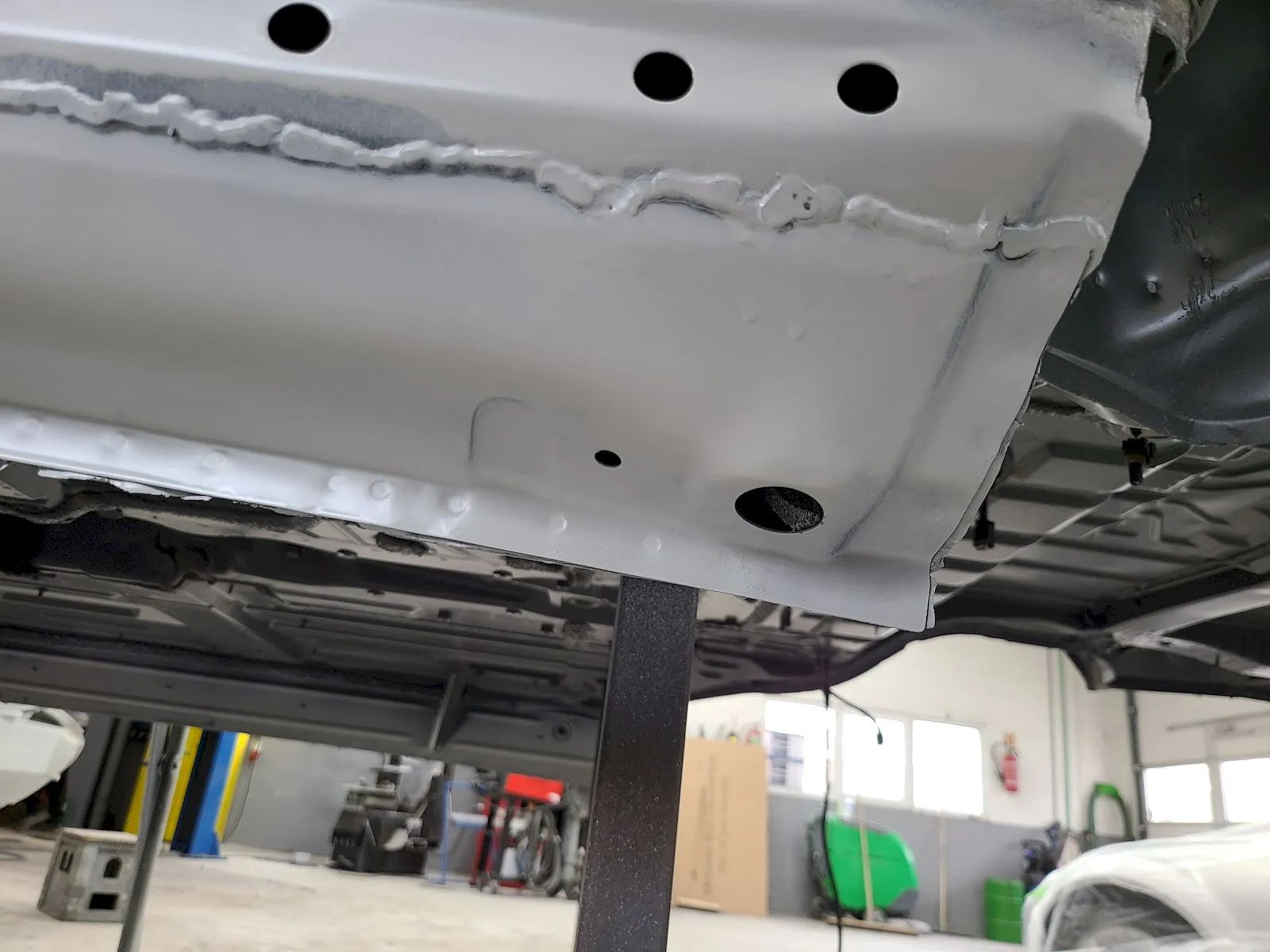 Die Karosserie ist jetzt soweit fertig, dass sie von außen grundiert werden kann. Das heißt, dass die Spachtel- und Schleifarbeiten beendet sind. Unten sind noch ein paar kleine Schweißarbeiten zu erledigen, wie z.B. das Anschweißen von ein paar Befestigungsbolzen für die Innenkotflügel. Danach erfolgt die Versiegelung und Lackierung von unten. Dann geht es oben weiter.
