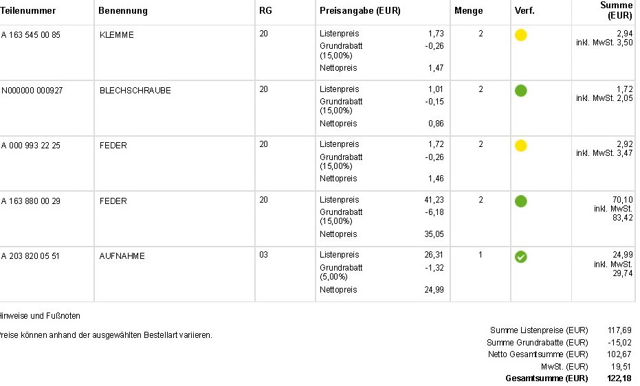 Es gibt wieder was zu tun. Insgesamt liegen im Warenkorb 8 Teile. Die Stoßstange (A 163 880 48 70) ist ja schon länger nicht mehr in der Wunschfarbe lieferbar. Also ohne "9744" am Ende. Die Lackierarbeiten für alle Teile wird sicher wieder mein Nachbar übernehmen.