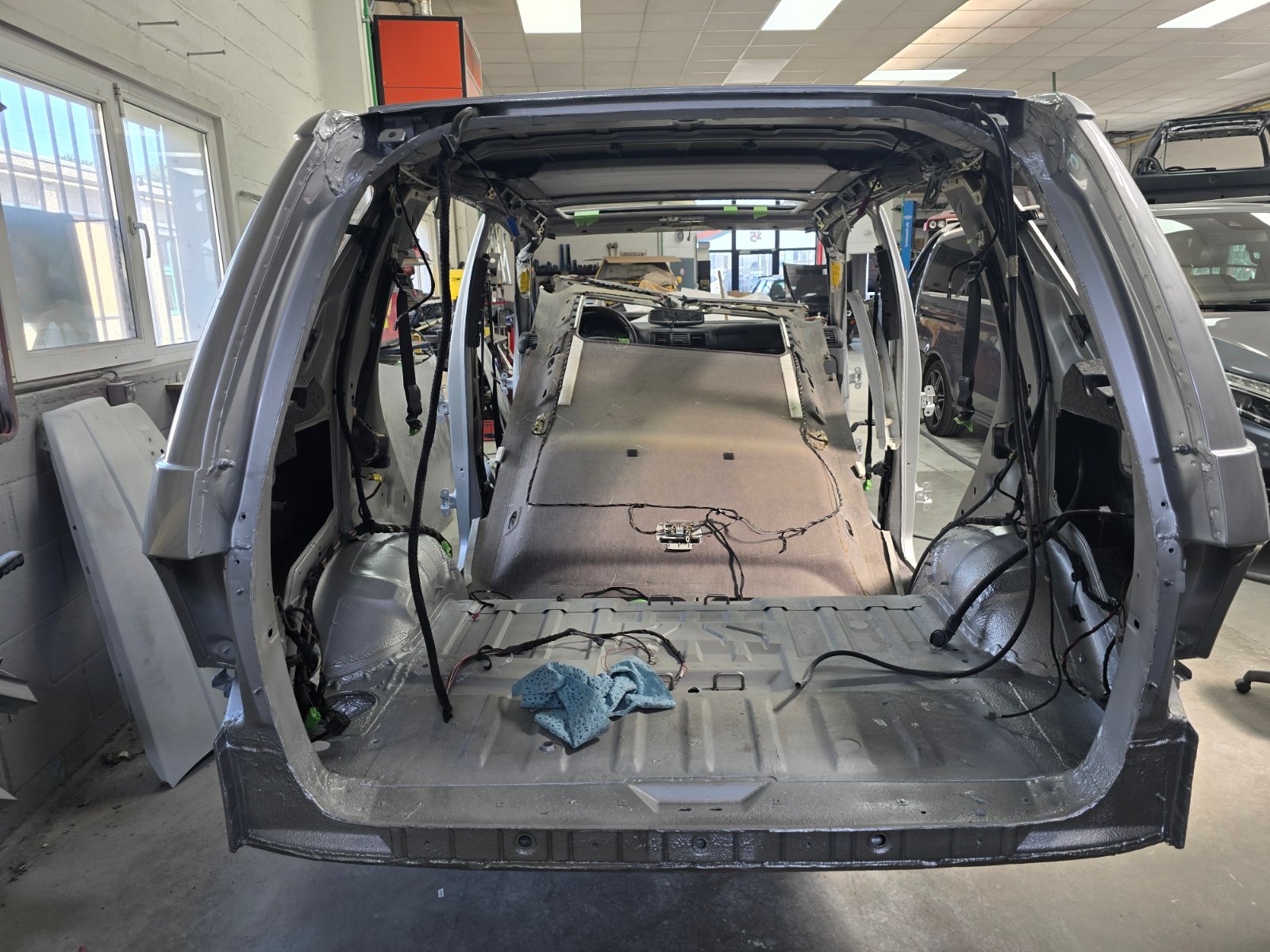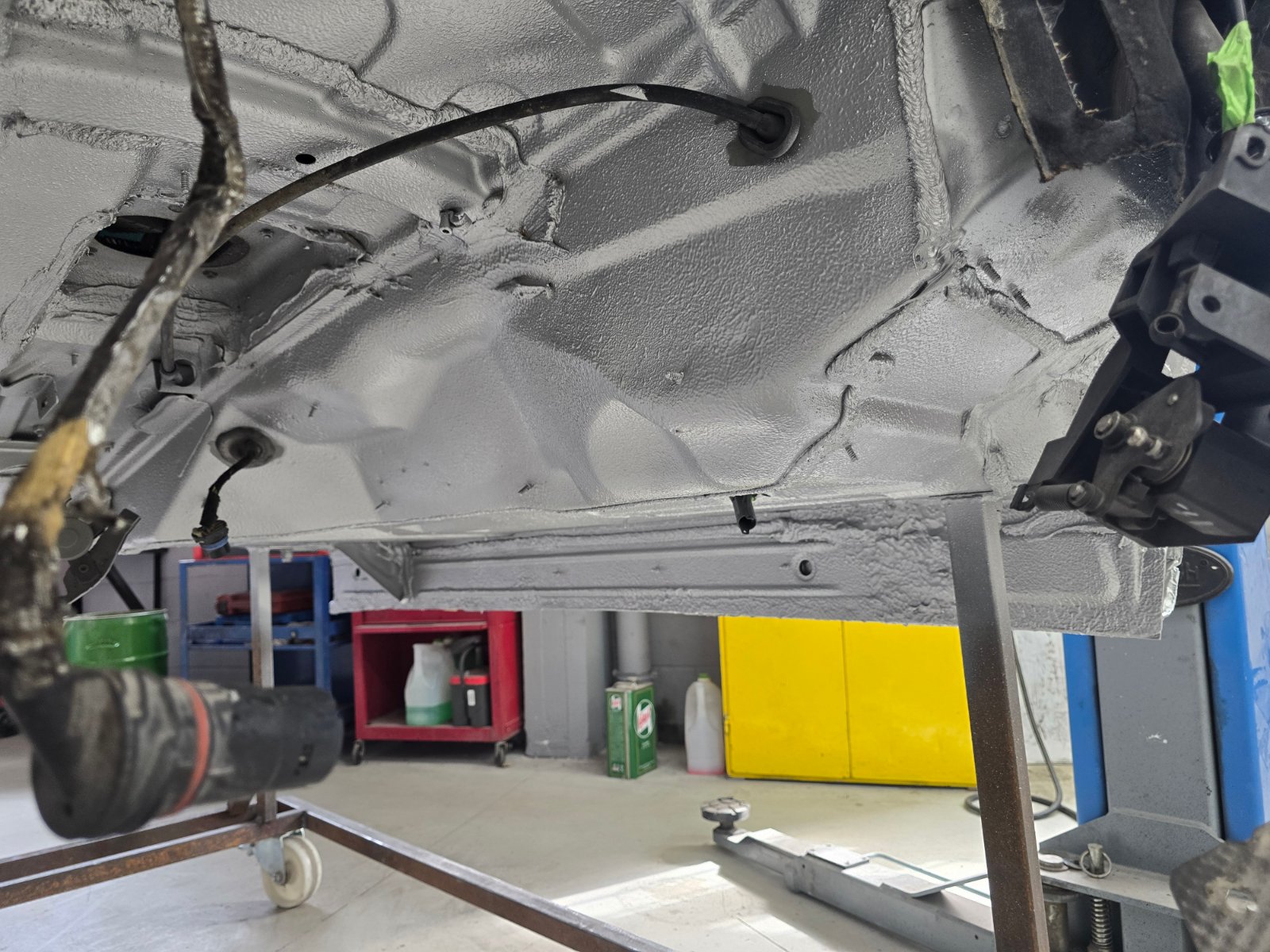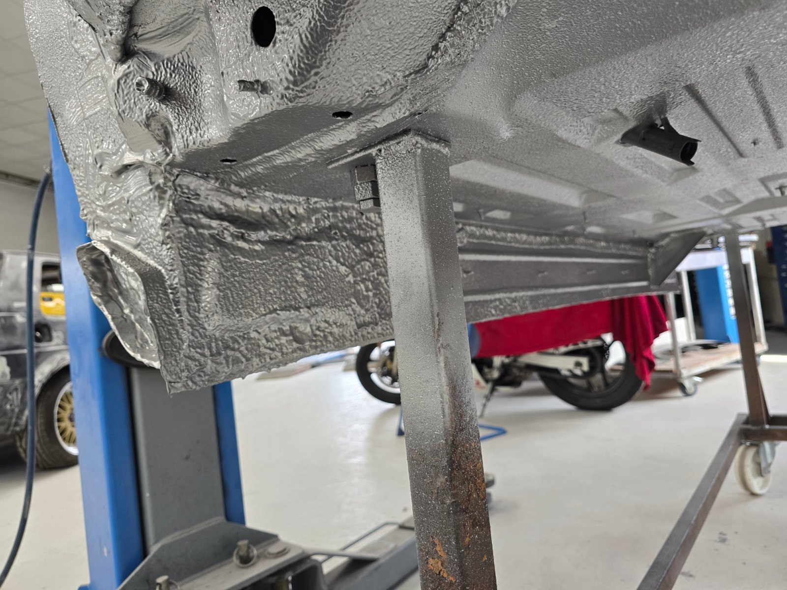 Heute gibt es Fotos von der von unten komplett mit Epoxy beschichteten und in Wagenfarbe lackierten Karosserie.