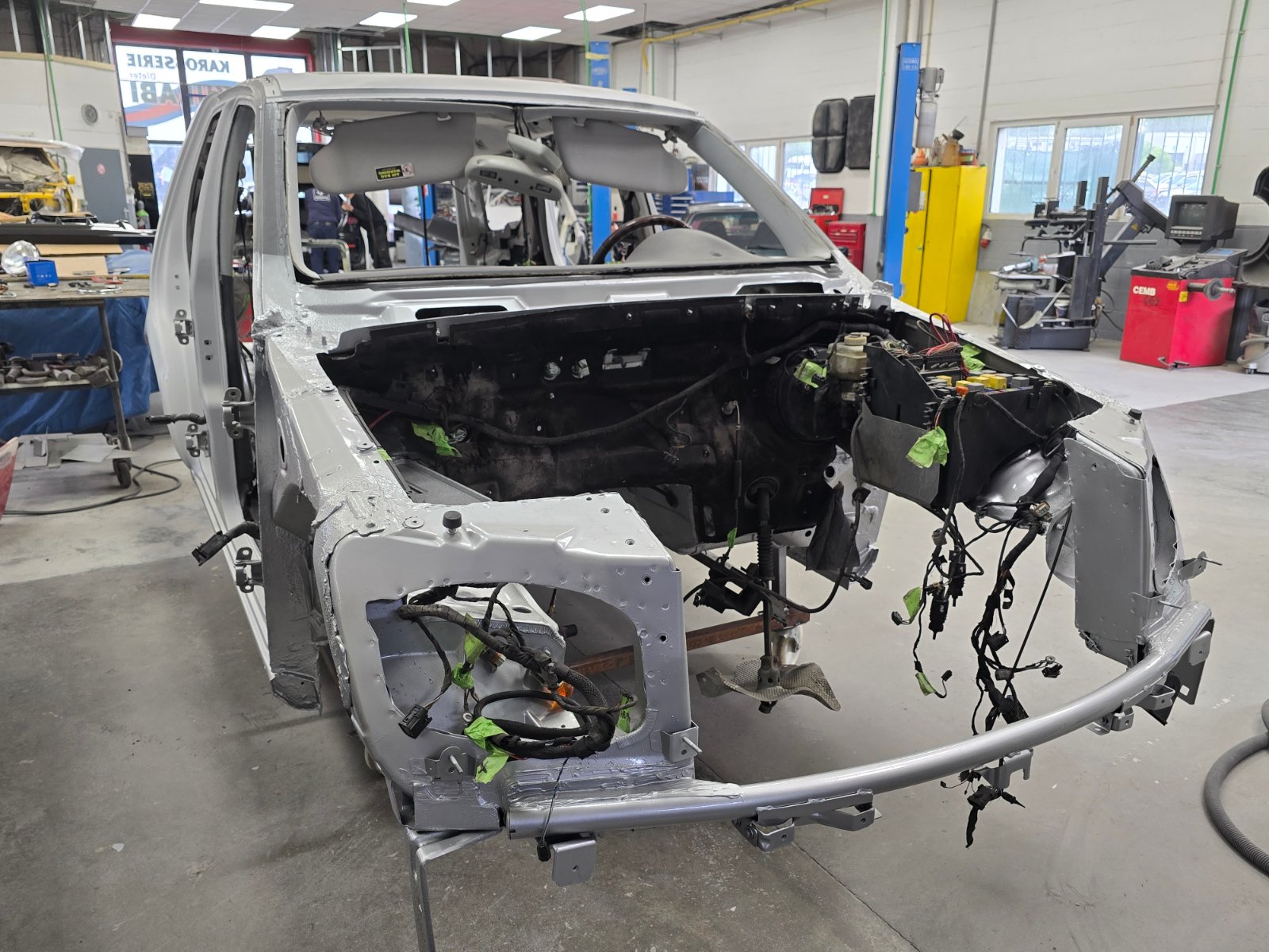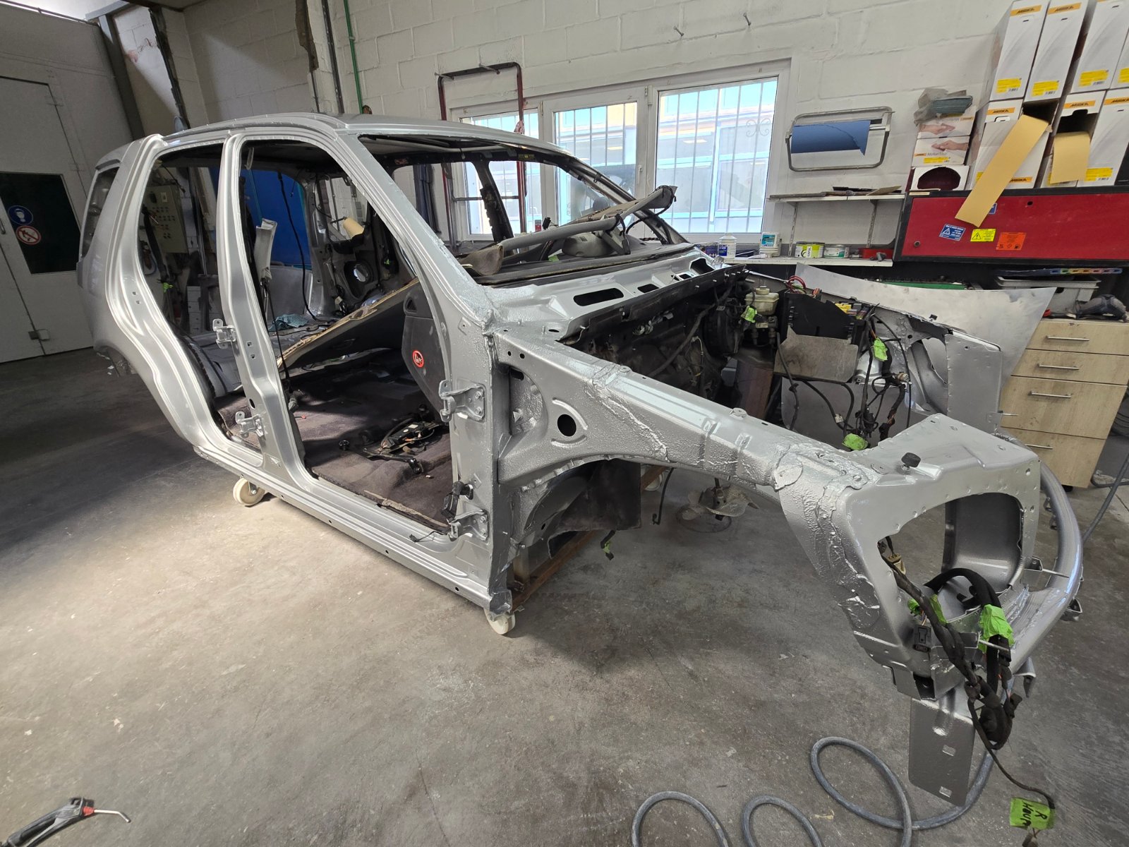 Heute habe ich unseren ML wieder einmal besucht. Inzwischen ist er tiefergelegt worden und es keimt die vorsichtige Hoffnung auf, dass die Karosserie gegen Ende der kommenden Woche lackiert werden wird. Anbei ein paar Fotos davon und auch noch eins von den Befestigungspunkten der Dachreling.