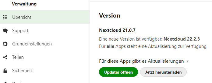 Das hab ich mir dann mal genauer angesehen.... Zunächst empfehle ich Ihnen ein komplettes Backup Ihrer aktuellen Nextclouddaten zu machen. Auch empfiehlt es sich für eine Aktualisierung alle Plugins zu deaktivieren.