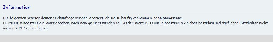 Es steht doch immer dabei, warum die Suche nicht funktioniert. Für "London" und "W163" werden zu viele Ergebnisse gefunden, "Scheibenwischer" ist zu lang. Die Idee, die Suche auf "*wischer*" einzugrenzen, kann wahrscheinlich nur ein IT-naher Mensch nachvollziehen und kann auch schon wieder zu zu vielen Suchergebnissen führen.