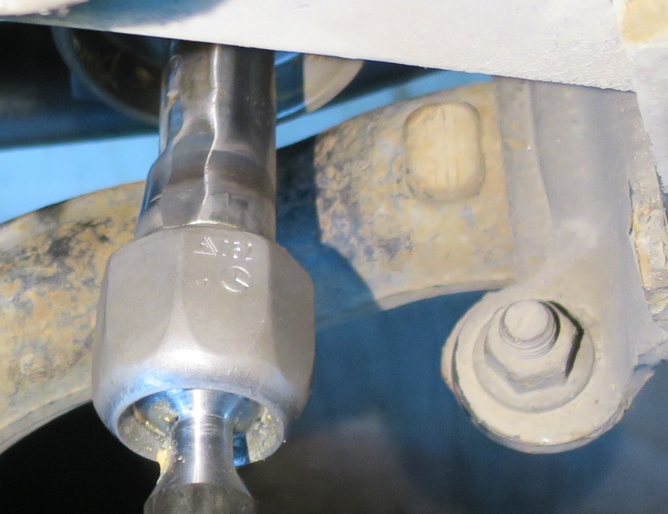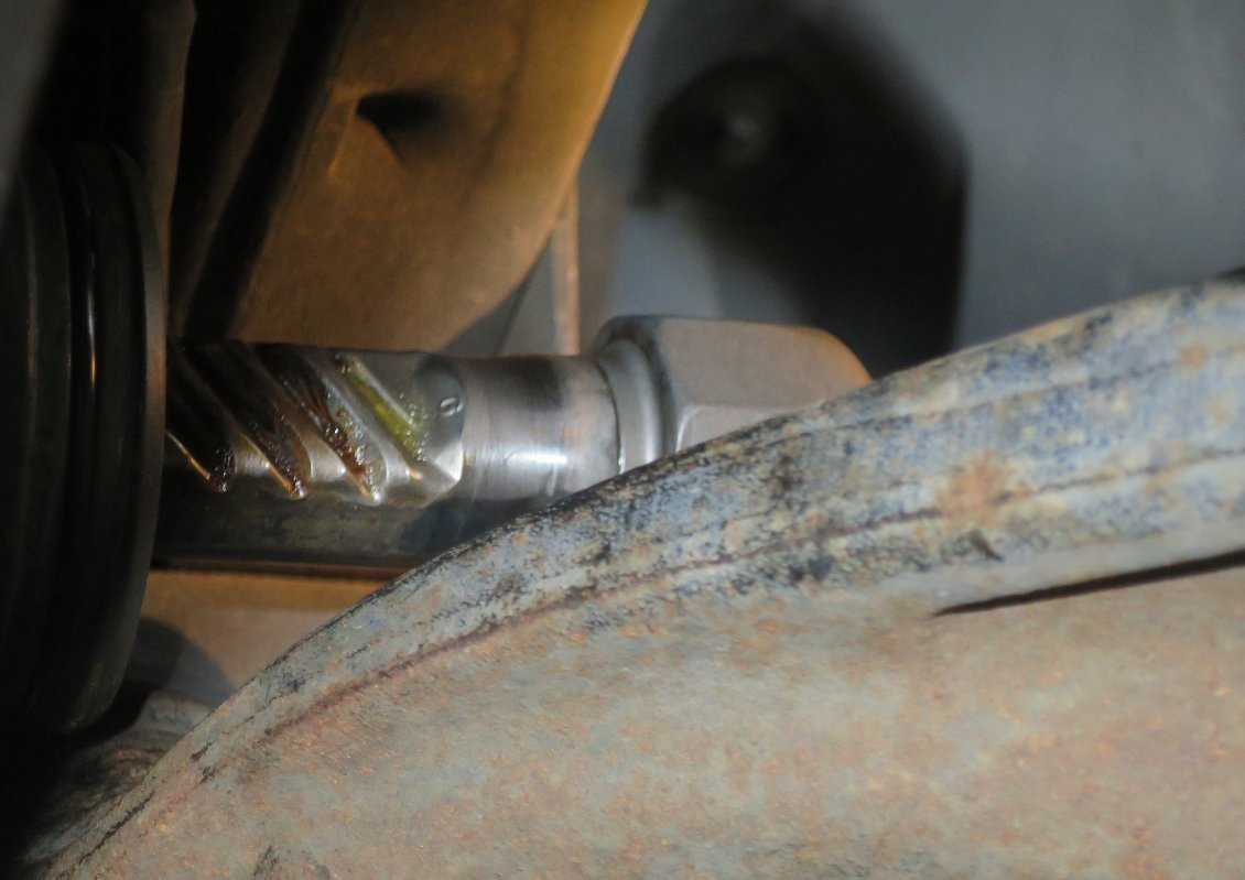 Da sich in meiner Reichweite wider Erwarten keinerlei 38er Schlüssel fand (darüber und darunter gab es genug), musste der Wechsel eh verschoben werden, aber: Ich konnte nirgends einen 24er Gabelschlüssel zum gegenhalten ansetzen, auch keine größeren Gabelschlüssel. Anbei ein paar Bilder vom linken Ende der Lenkung, dort wo das linke Axialgelenk sitzt.