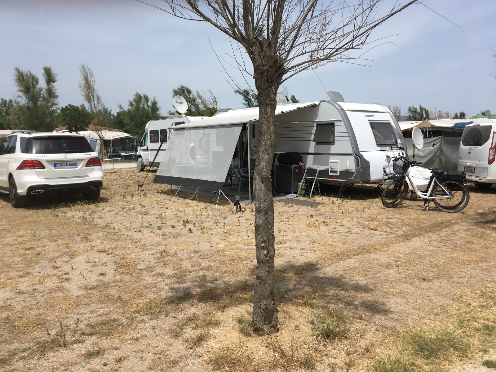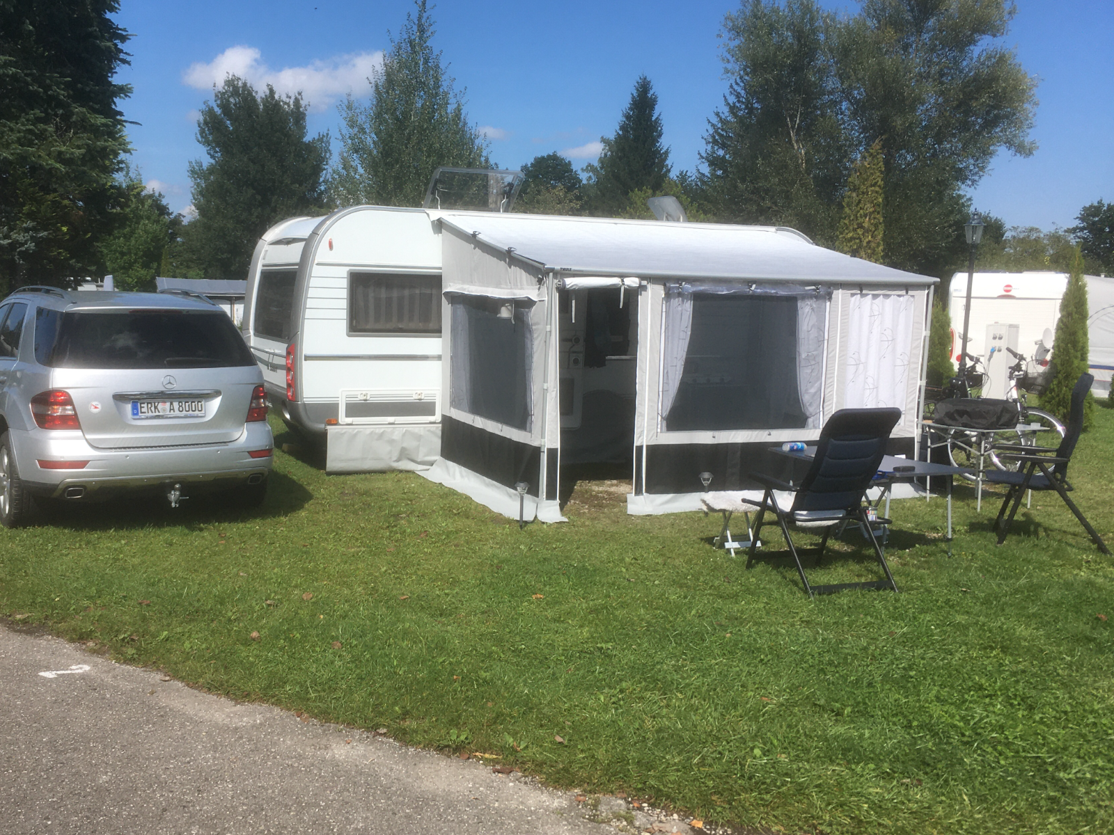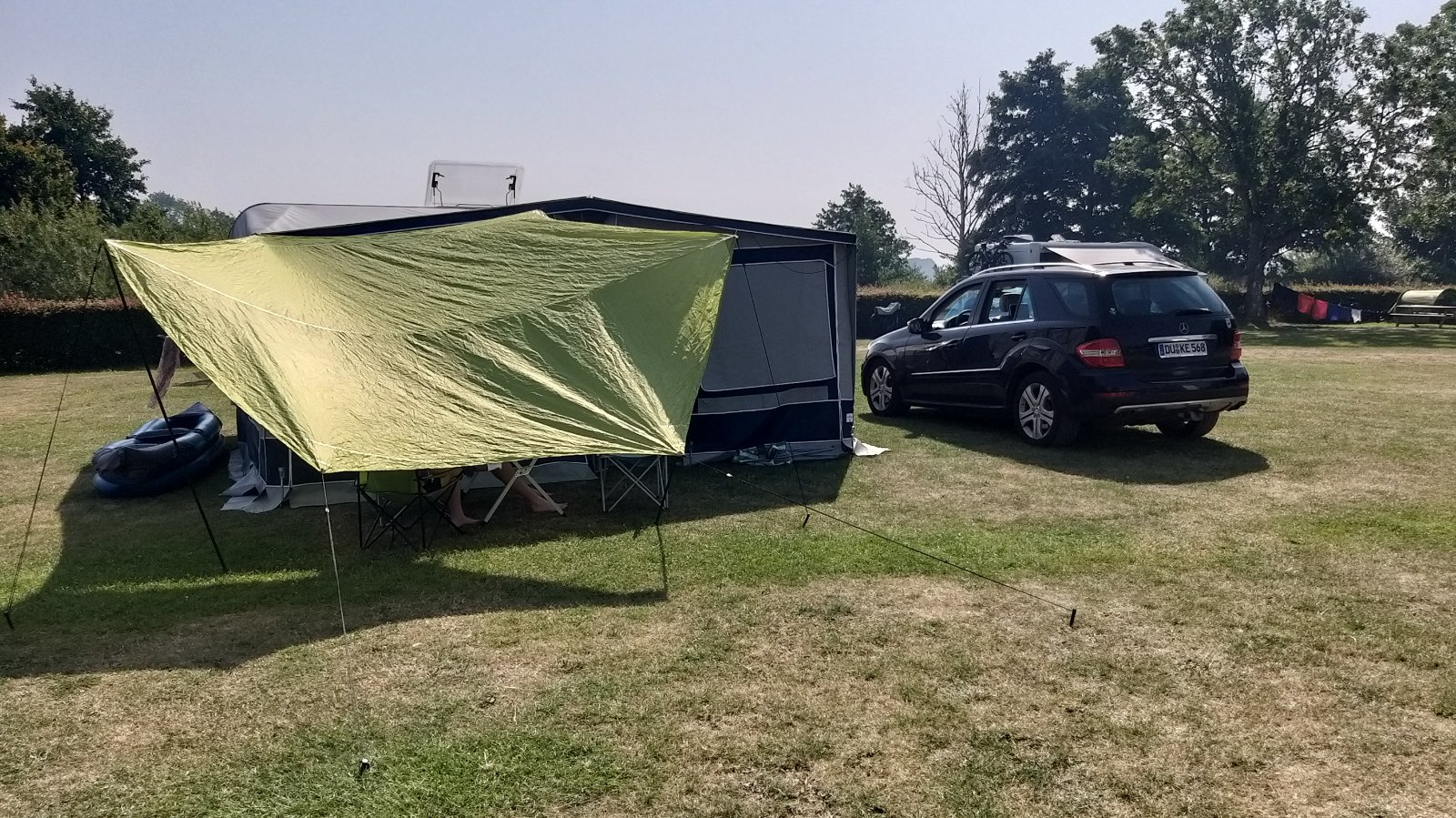 Vielleicht reisen wir demnächst nur mit Sackmarkise. Dann würde das natürlich anders gehen. Übrigens war das mir der Fähre zwischen Puttgarden und Rödbyhavn so effizient durchgetaktet und unser Gespann stand so eingekeilt zwischen großen Wohnmobilen und LKW, dass weder Platz noch Zeit für Bilder vom Gespann in der Fähre war.