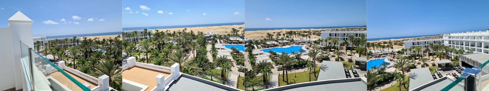 Und so schauen wir vom Balkon aus in unserem neuen Zimmer in den Garten und über die Dünen zum Meer.