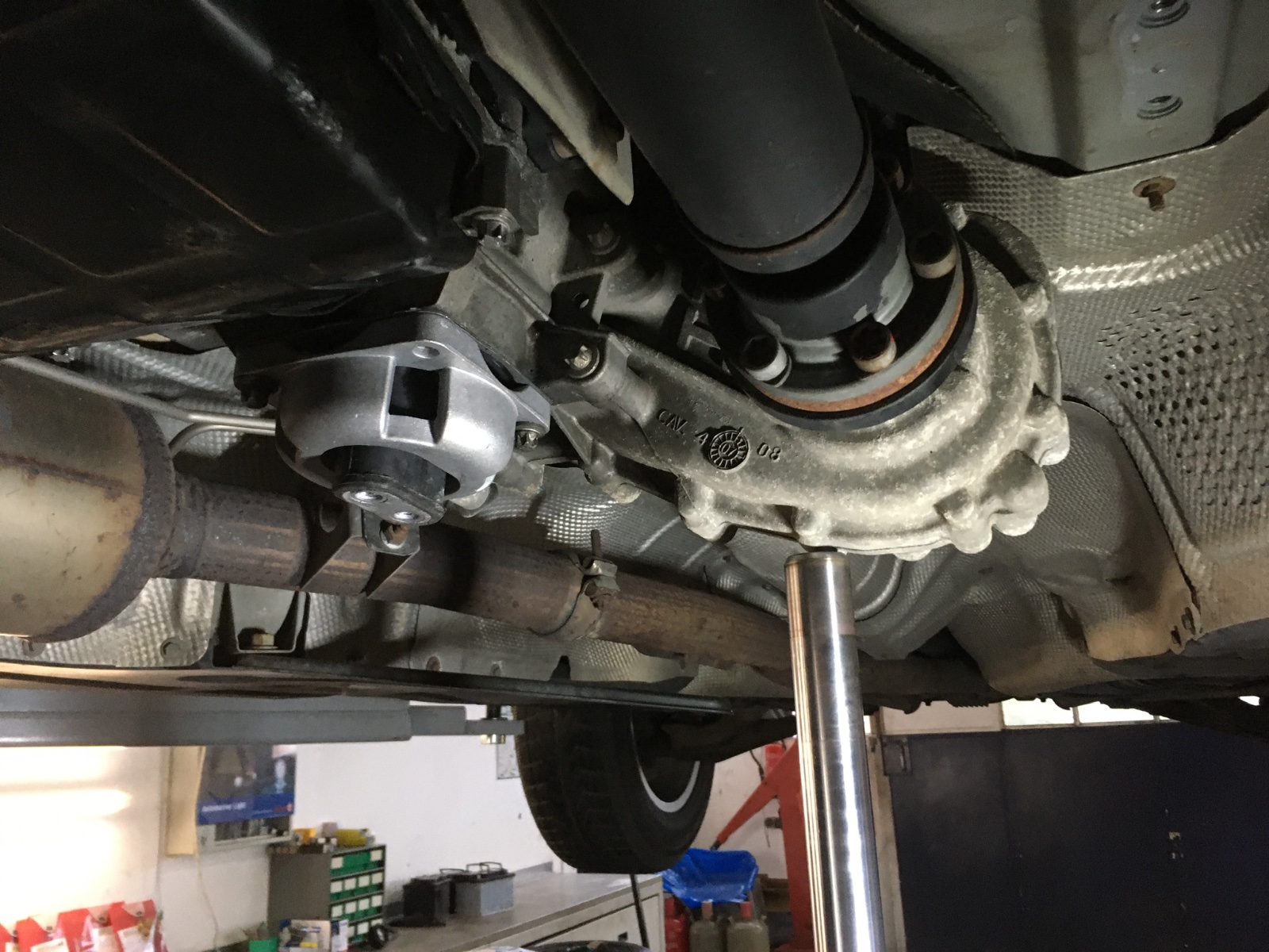 hat dann das Problem gelöst...! Aber vorher mussten wir erst mal Platz schaffen: Also die Montagetraverse unterhalb des Getriebes abgebaut: Nochmal 14 (dicke) Schrauben... und das Getriebe mit einer hydraulischen Stütze abgefangen. Dann ging es ganz leicht