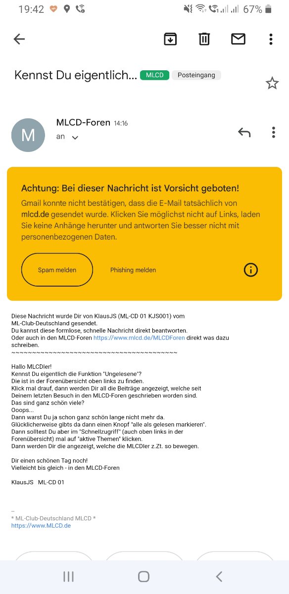 Ob da vielleicht was an den E-Mail-Einstellungen des Forums nicht stimmt, dass Google der Meinung ist,dass die E-Mail nicht verifiziert vom MLCD stammen könnte?