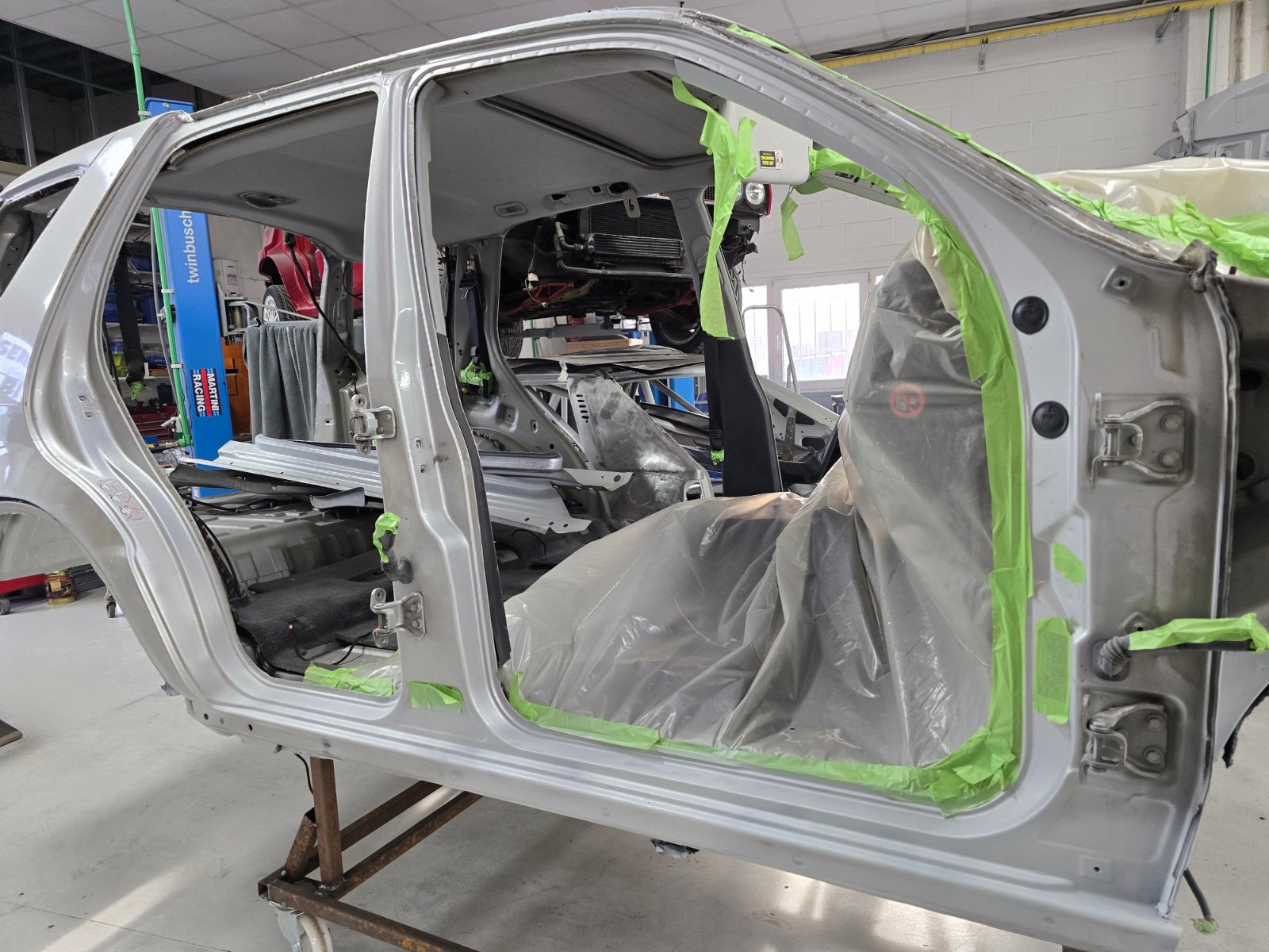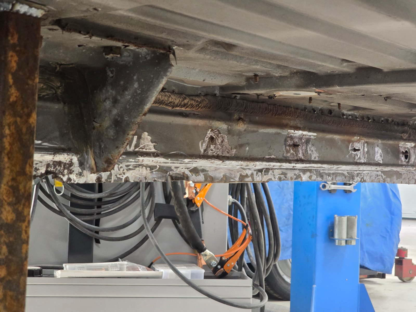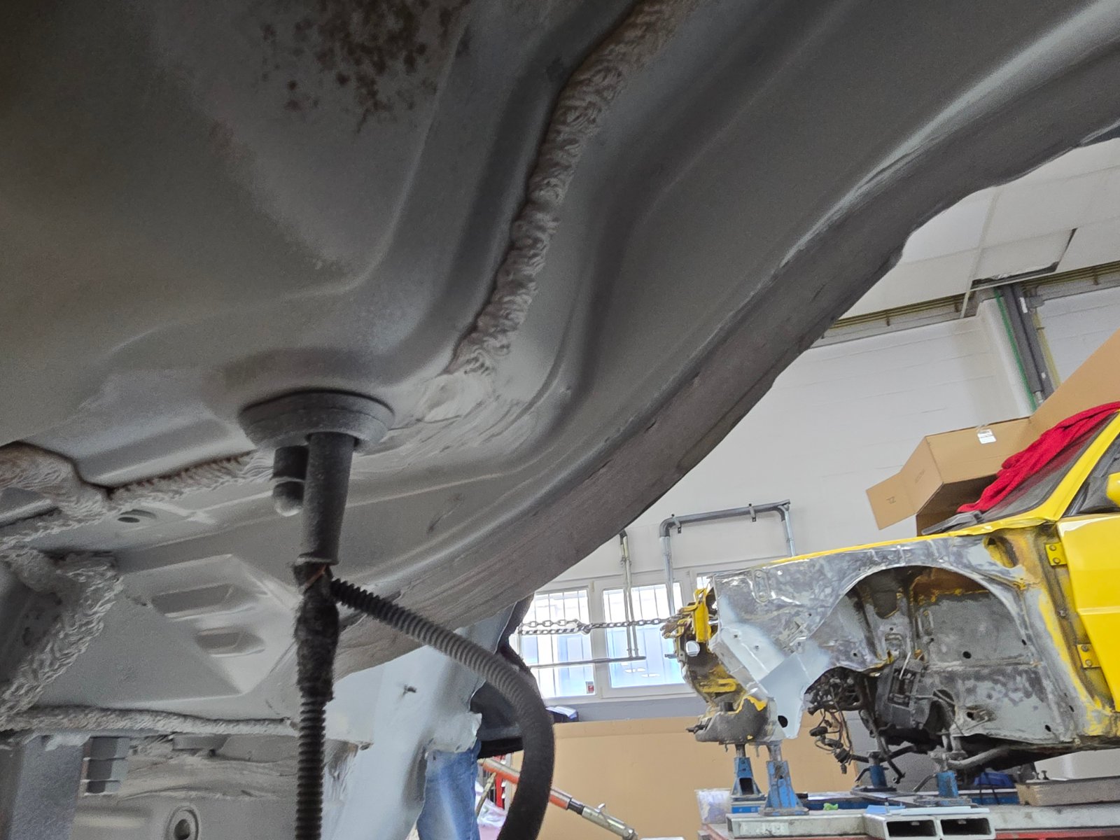 Es geht zwar langsam voran, aber es soll ja auch ordentlich werden. Dieter macht aber eine wirklich super Arbeit. Dort steht gleichzeitig auch noch ein Alfa Spider, der im Innenraum zunächst einmal mit zwei diagonal eingeschweißten Streben verstärkt wurde, damit er sich nicht verziehen kann, der in deutlich schlechterem Zustand, als unser ML war. Auch daran arbeitet Dieter natürlich weiter. Und Laufkundschaft mit kleinen Blechschäden oder TÜV kommt auch dazwischen. Ich bin aber sicher, dass ich hier sonst keinen Betrieb gefunden hätte, der diese Arbeit übernommen hätte und obendrein derart sorgfältig arbeitet.