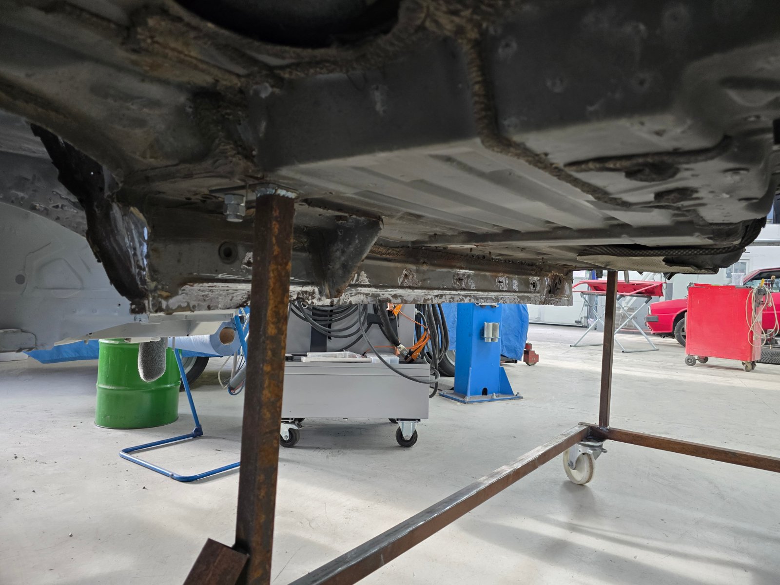 So richtig viel hat sich anscheinend auf den ersten Blick nicht getan, aber genauer betrachtet war zu sehen, dass alle Roststellen rundum bereits sehr gut entfernt wurden und er jetzt nur noch auf besseres Wetter zum Sandstrahlen wartete, denn er stand schon mit den Hufen scharrend vor dem Tor. Eigentlich so ohne Hufe, denn der Rahmen mit den "Hufen" wurde ja schon gesandstrahlt. Gesandstrahlt wird eben wegen der großen Staubentwicklung draußen. Mit viel Glück wird es am Sonntag sonnig werden und Dieter wird dann trotz Sonntag tätig werden. Aber da steckt man eben nicht drin. Dann wird direkt alles mit Epoxidfüller versiegelt und die Schweißarbeiten können beginnen. Aber dann sind die schlimmsten Dinge alle erledigt.