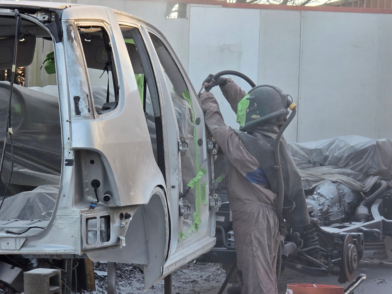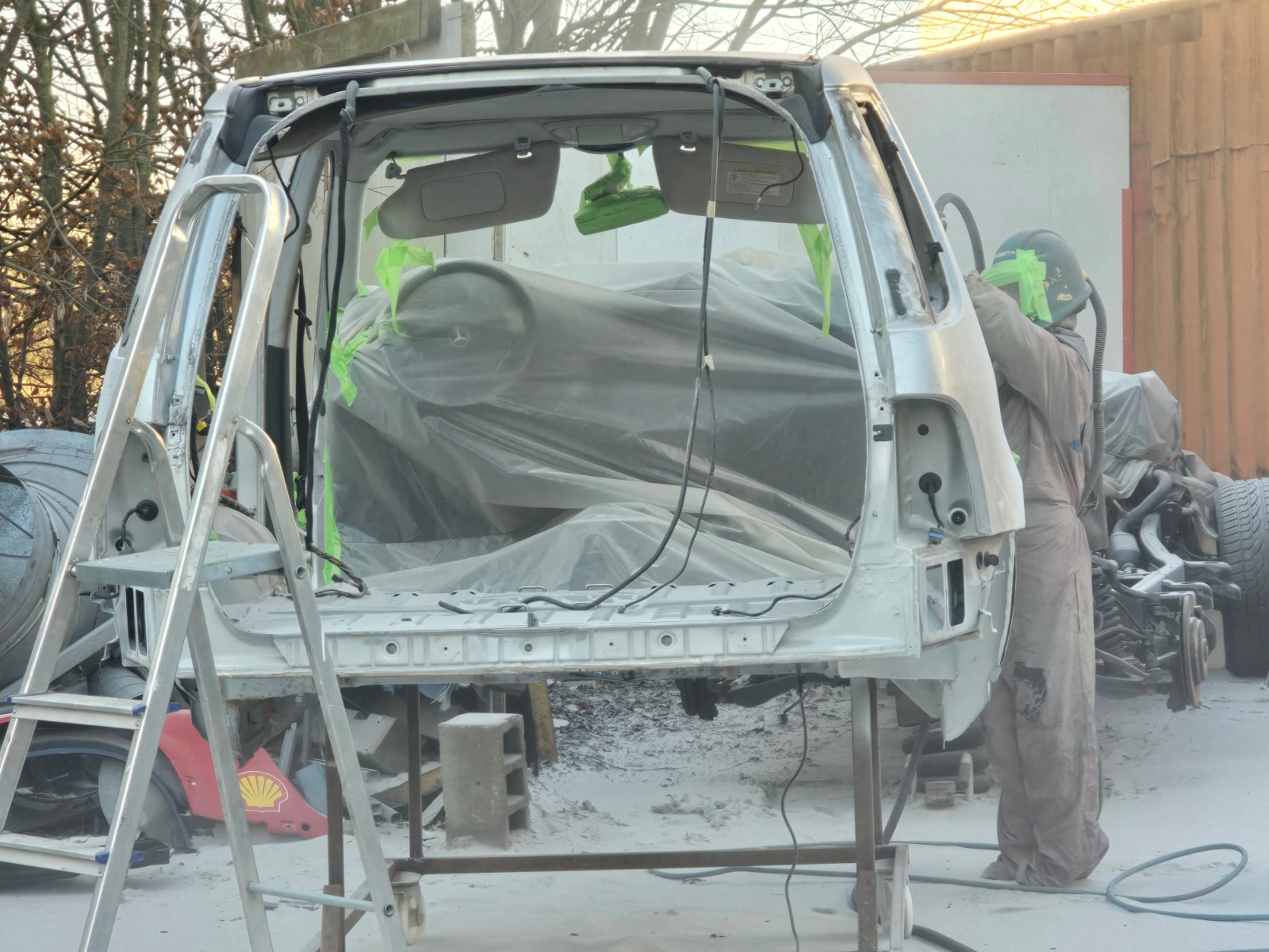 Heute habe ich wieder mal unseren ML besucht. Und der hat Fortschritte gemacht. Zumindest die rechte Seite der Karosserie ist inzwischen gesandstrahlt und mit EPOXY-Grundierung versehen., dann fing es wieder an zu regnen. Morgen soll es aber trocken bleiben. Dann folgt der zweite Streich und danach die Schweißarbeiten. Anbei ein paar Fotos vom aktuellen Stand.