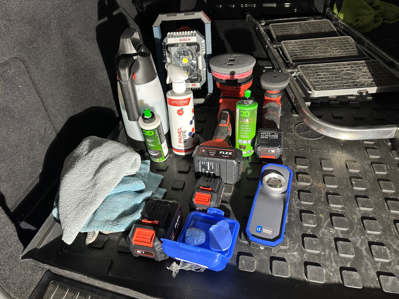 In der Tiefgarage waschen und anschließend polieren. Zuerst hab ich es mit einer Feinpolitur probiert, doch der Klarlack ist so hart das härtere Mittel angesagt waren. Die Motorhaube mit einem mittleren Pad und der 520 Politur, den Rest dann mit der gleichen Politur und einem feinen Pad, ein Finisch-Pad. Alle feinen Waschstraßen-Kratzer beseitigt und ein Hologramm freies Ergebnis: mein verwendetes Werkzeug Details, falls es von Interesse ist. Bei Fragen gern her damit.