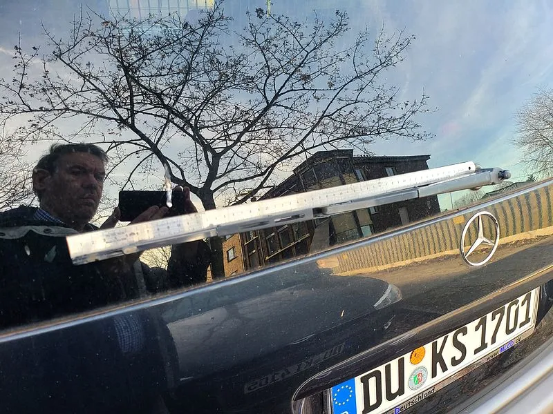 Da wird doch mit dem frisch angebrachten Wischerblatt gleich auch noch die Frontscheibe des weißen KIA mit gewischt.
