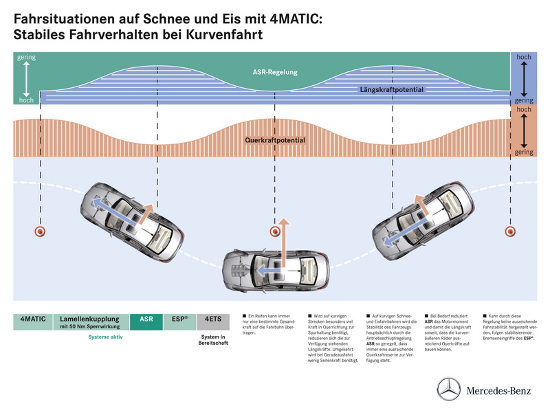 Gemeinsames Merkmal dieser Systeme ist es, den Radschlupf mit Hilfe moderner Mikroelektronik und Hydraulik zu erfassen und zu begrenzen, um die Längsdynamik eines Automobils zu verbessern. Die 4MATIC arbeitet permanent und verteilt im normalen Fahrbetrieb auf griffigem Untergrund die Antriebskraft