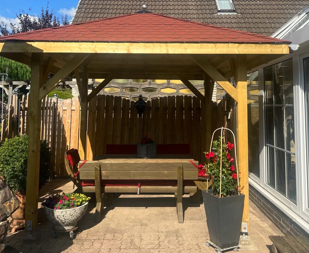 Erst einmal mußte ich mir Holz kaufen, was schon recht schwierig und teuer war. Dann war ich damit beschäftigt eine Überdachung und einen Pavillon zu bauen. Mein alter Pavillon aus Aluprofilrohr war in die Jahre gekommen und die Stoffdächer hielten auch immer nur ein Jahr. Anbei zwei Fotos nach der Fertigstellung.