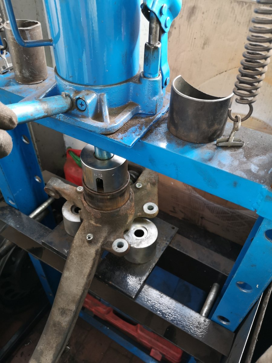 Klar, die und die rechte auch, waren irgendwann dran. Ich hatte mich schon gewundert, daß die bei meinem ML solange durchgehalten haben.Und dann, vollkommen unerwartet, die Manschette des unteren Traggelenks vorne links.Denn die hab ich doch schon mal, mit federführender Hilfe vom Olaf75 getauscht.