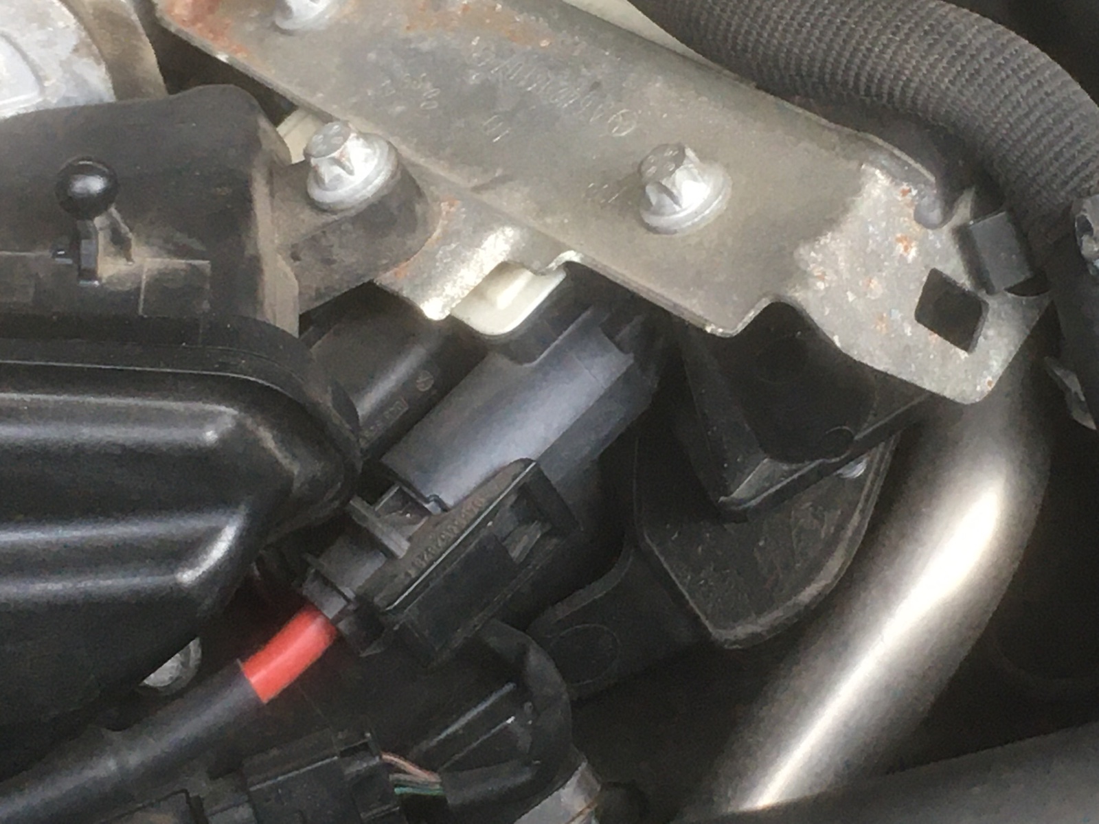 Auf dem ersten Foto sieht man die Position: gleich rechts neben dem Ölmessstab. Als Erstes muss man etwas Platz schaffen: das schwarze „Kästchen“ aus Plastik ist mit 3 ETorx 10 befestigt und läßt sich sehr einfach abziehen (aufpassen auf den Dichtring!!).