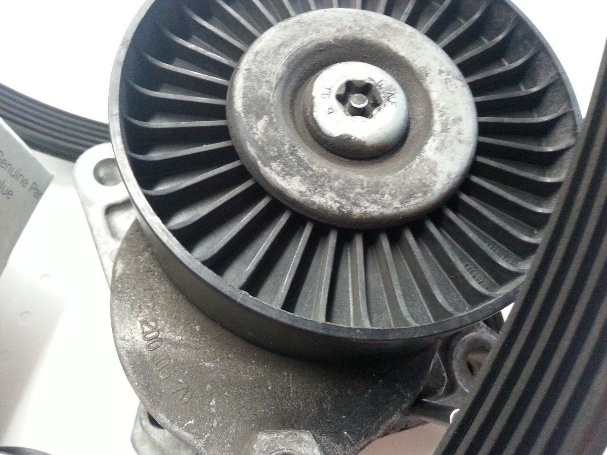 Und dann wollte ich ja auch noch die Altteile der "Kur" beim AhK zeigen, die mein ML anläßlich seines 18. Geburtstags bekommen hat.Der Rippenriemen der noch ganz gut aussieht.Die schon reichlich schwergängige Umlenkrolle.Und die Spannrolle, welche schon etwas Spiel hat.