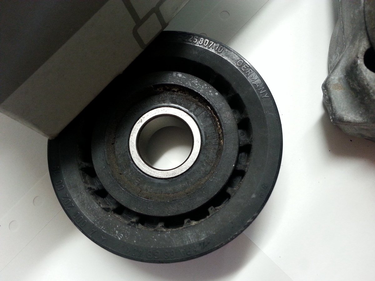 Und dann wollte ich ja auch noch die Altteile der "Kur" beim AhK zeigen, die mein ML anläßlich seines 18. Geburtstags bekommen hat.Der Rippenriemen der noch ganz gut aussieht.Die schon reichlich schwergängige Umlenkrolle.Und die Spannrolle, welche schon etwas Spiel hat.