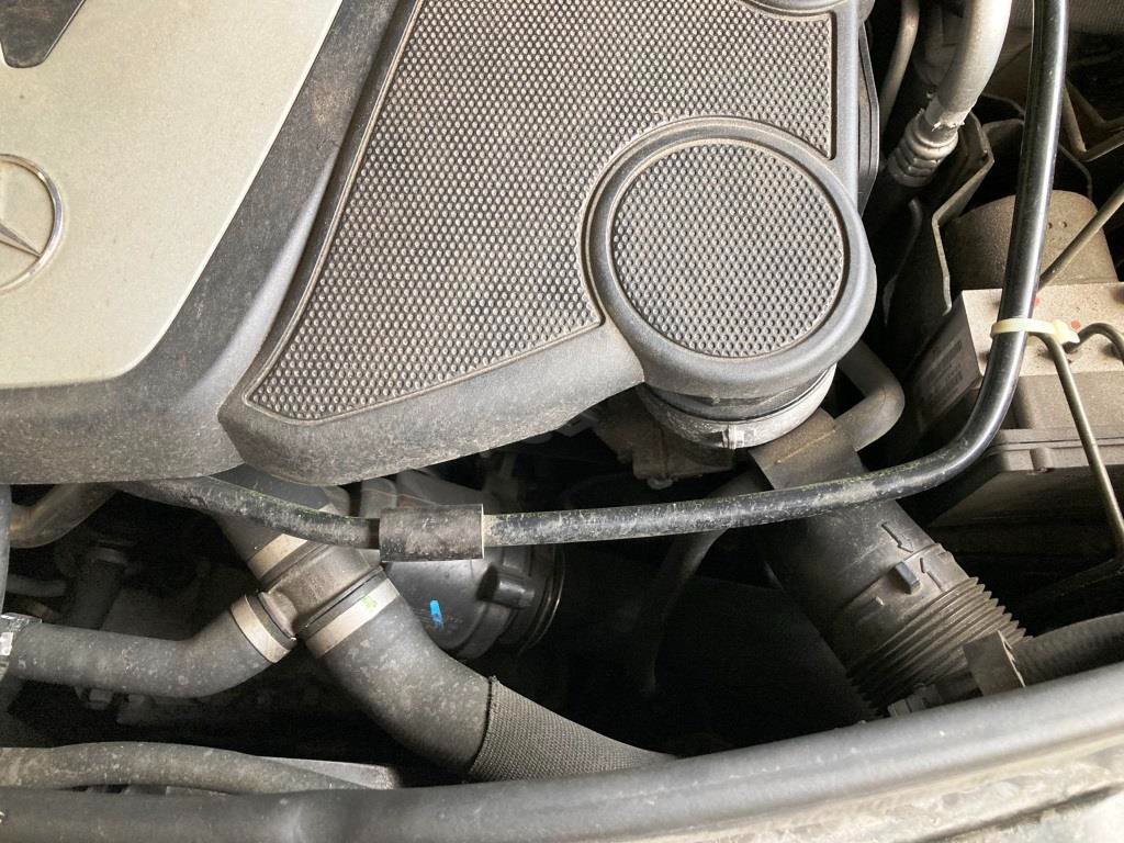 Lärmmacher: Der kleine Schlauch klopft bei jeder Abwärtsbewegung des Autos (runterfahren von der Bodenschwelle) auf den großen Kühlschlauch - genau mit dem Schlauchschutz auf die Schelle .