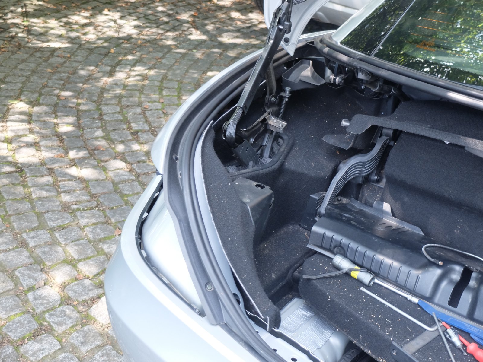 Leider bin ich erst heute dazu gekommen, die Rückleuchte des Rennschlittens zu erneuern. Eigentlich nicht schwierig, wenn man erst einmal weiß, wo sich welche Verkleidungsclips befinden. Auch muss man herausfinden, dass man an eine Mutter nur gelangt, wenn man das Schiebedach öffnet, aber stoppt, sobald der Kofferdeckel senkrecht steht. Insgesamt nur drei Muttern, aber diverse Clips.