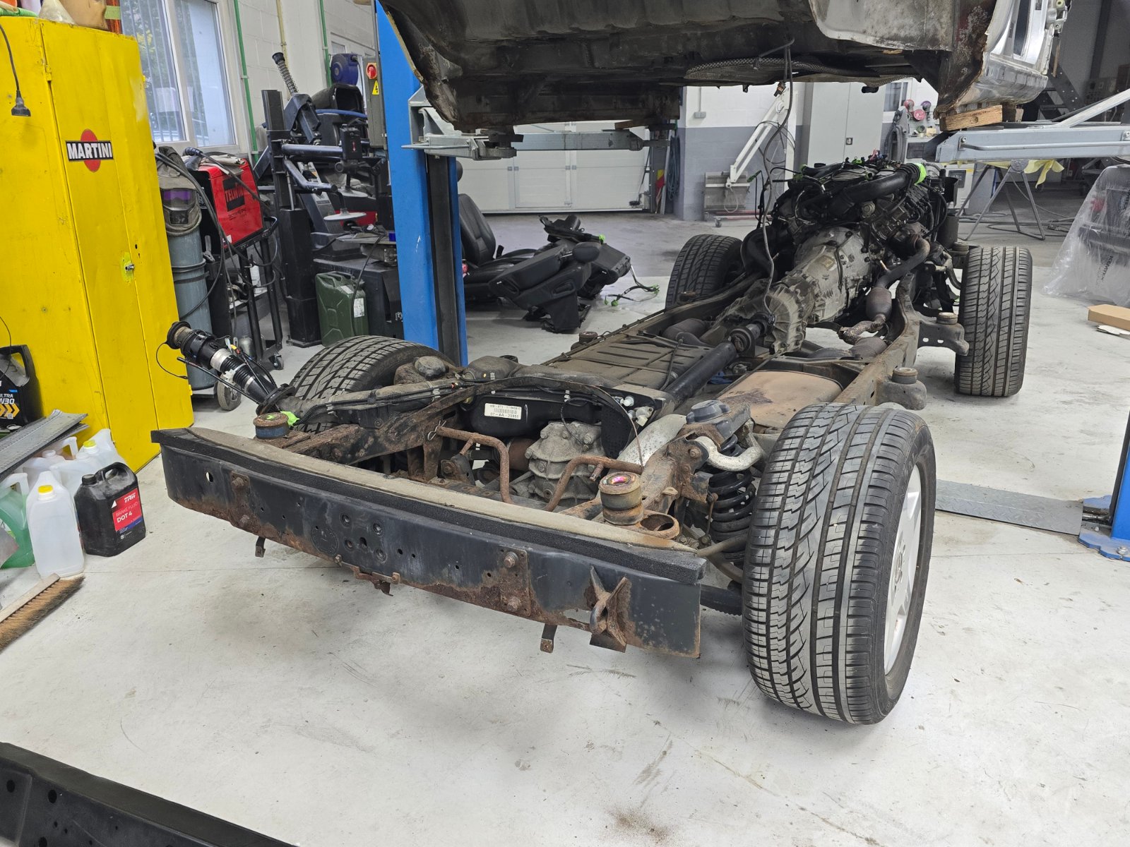 Heute habe ich mal wieder unseren ML besucht. Er macht Fortschritte. Die Vorbereitungen für das Abheben der Karosserie sind fast vollständig abgeschlossen. Geplant ist es, diese morgen vom Rahmen zu trennen. Anbei ein paar neue Fotos dazu.