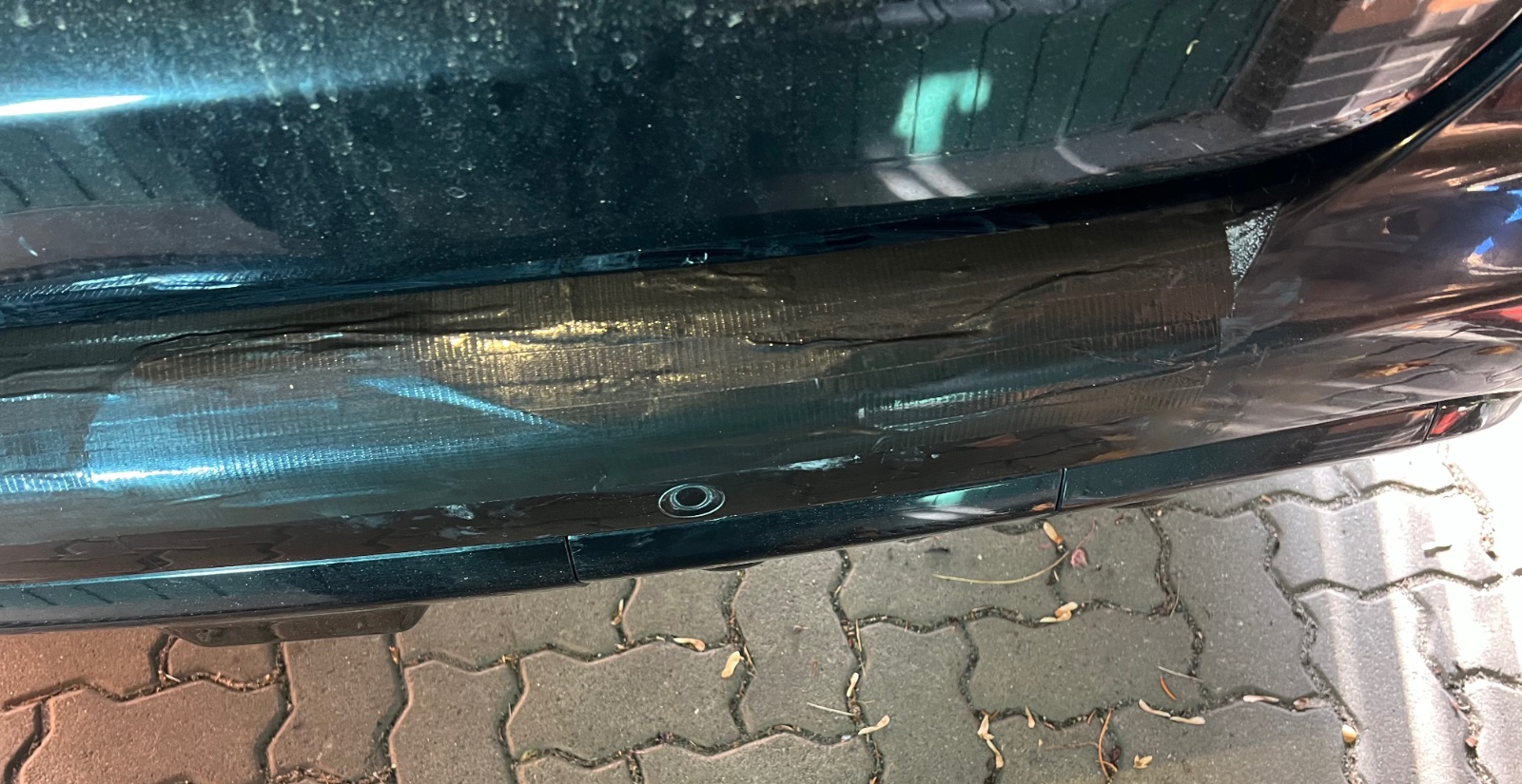 Also habe ich alles notdürftig von außen verklebt und dann erst einmal mit schwarzen Panzerband überklebt. Die Stoßstange ist nun wieder montiert. Jetzt bin auf der Suche nach einer gebrauchten, möglichst in der Farbe 197