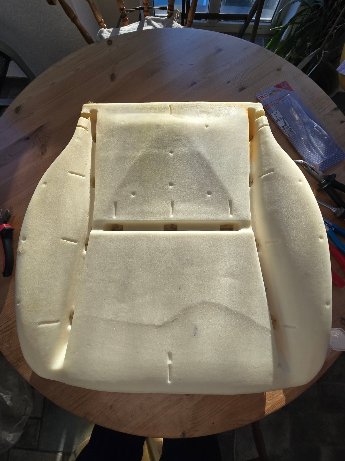 Seit mehr als einem Jahr steht schon der Fahrersitz unseres MLs im Flur, da dieser ein neues Sitzkissen und auch zwei neue Kunststoffverkleidungen erhalten soll. Das Sitzkissen lagert schon seit gut 10 Jahren bei mir, jetzt sollte es endlich verbaut werden. Die vordere sowie die linke Plastikverkleidung (die mit den Schaltern für die Sitzverstellung) warten auch schon lange auf Ersatz. Heute sollte das alles endlich werden, damit unser ML nicht noch darauf warten muss. Wie man den Sitzbezug erneuert, hatte ich ja bereits in einem DIY 2008 beschrieben. Die Arbeit ist dieselbe, daher beschränke ich mich auf die Fotos. Diesmal hatte ich allerdings eine spezielle Zange für die Befestigungsringe am Start, weil es sonst doch recht hakelig ist.