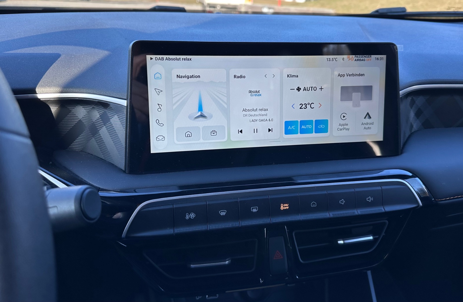 Der Wählhebel ist auf der Mittelkonsole ein Dreh-Schalter, zum Parken musst dann da drauf drücken. Sämtliche andere Funktionen zum Radio oder Heizung bedienen sind im mittleren Bildschirm durch Wischen einzustellen. Um aus dem Menü zurück zu kommen brauchst vermutlich einige Android-Erfahrung. Mir erschließt es sich bis heute nicht. Der Spurhalte Assistent greift gefühlt immer ein, rechts fahren verhindert der vollkommen und lenkt selbstständig in die Fahrbahnmitte. Ausschalten? Hab ich nicht in de verschachtelten Menü gefunden. Den Tempomat allein einschalten? Hab ich nicht gefunden, nur einen Knopf zum Tempomat mit Abstandshalter und Lenkassistent. Eine Erhöhung der Geschwindigkeit? Hat sich mir nicht erschlossen. Zum öffnen der Tankklappe, die sich hinten links befindet, dient ein Zugschalter im Armaturenbrett neben dem Zughebel der Motorhaube. Mein Fahreindruck: Lenkung teigig, keine wirkliche Rückmeldung von der Straße. Motor und Antrieb: laut und sehr heftige Dröhngeräusche. Sitze vorn: Beinauflage viel zu kurz, Sitze insgesamt viel zu weich und kein Seitenhalt… Verbrauch laut Anzeige bei meinem Streckenprofil ca 5 Liter Super