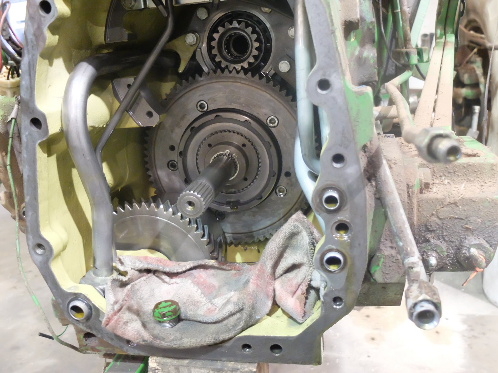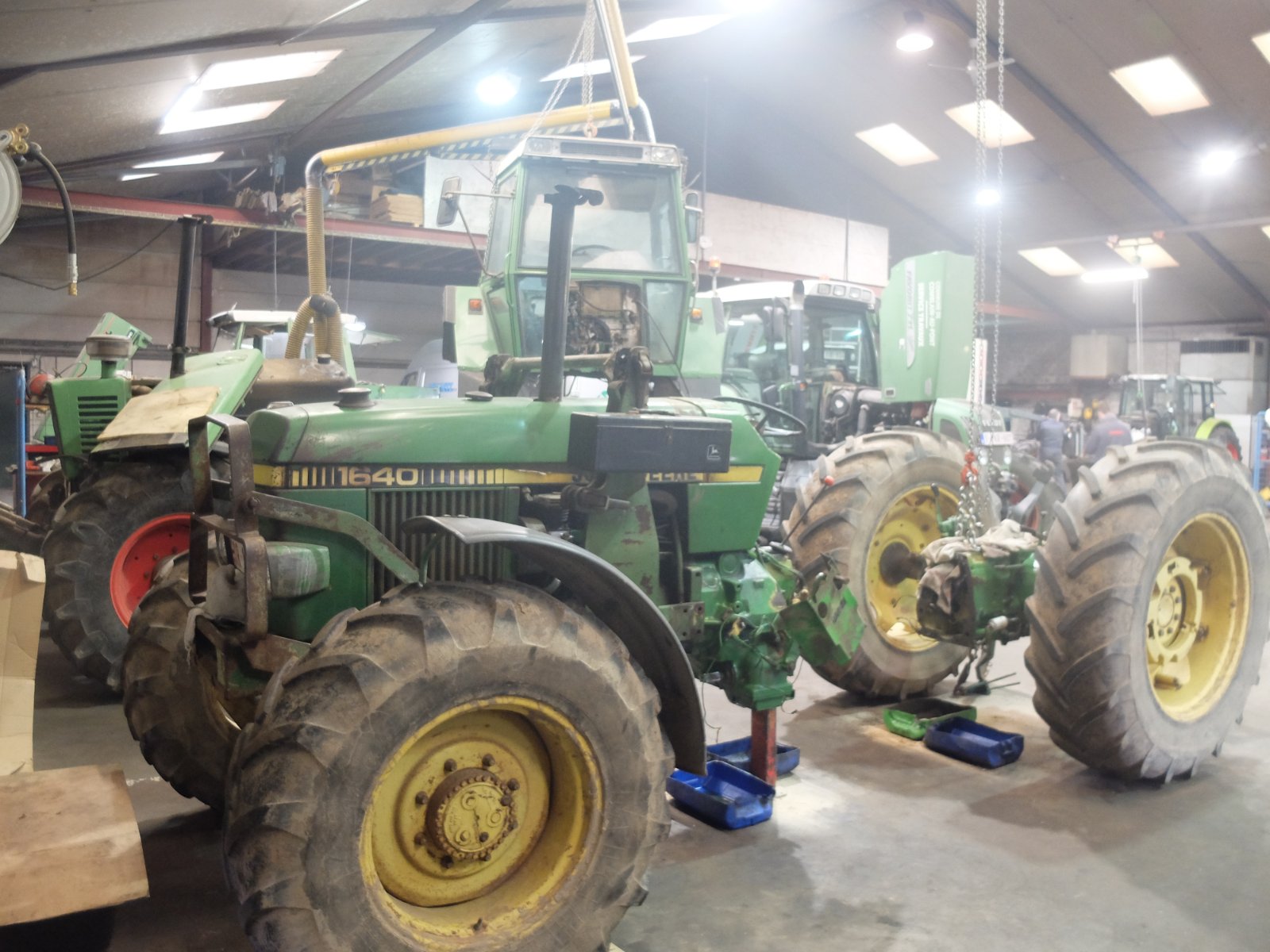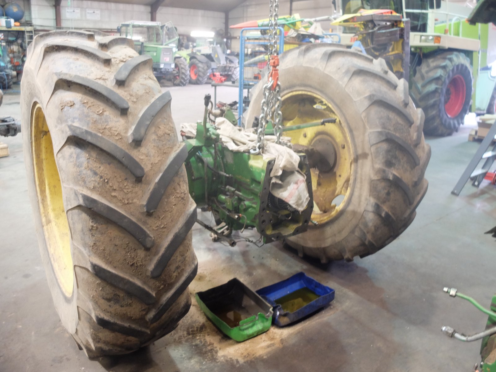 Unser Johnny steht mal wieder zur Reparatur beim lokal angesiedeltem Landmaschinenhändler, wegen seines Getriebeproblems. Das Geräusch ist nicht immer vorhanden, aber wenn es auftritt, ist es heftig. Um das vorzuführen, musste ich ca. 15 Minuten auf dem Hof der Werkstatt vor und zurückfahren, bis der sehr erfahrene Monteur, der bei John Deere gelernt hat und etwa 60 Jahre alt sein dürfte, dieses auch hören konnte. Jetzt steht der Johnny da, natürlich Kabine demontiert und in zwei Teile zerlegt. Vorne Motor mit Vorderachse und hinten Getriebe mit Hinterachse. Was man bei geöffnetem oberen und vorderem (dieser mit 3? Zahnrädern) Getriebedeckel sehen konnte, ist, dass ein Getriebelager extrem viel Spiel hat. Das dürfte das vom Durchmesser her größte Lager sein, das im Getriebe verbaut ist. Die Geräusche treten nur in der langsamen Baugruppe auf. Dort aber, sowohl vorwärts, als auch rückwärts. In den Straßengängen gibt es diesbezüglich keine Beanstandungen, aber seit ich ihn habe, ist das Geräusch im 3. Straßengang lauter, als in den anderen.