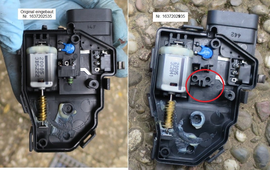 Dann hatte ich von einem Schlachtmodell eine ganze Fahrertür gekauft, da mir die gebrauchten und erst recht neuen Türschlösser viel zu teuer sind. Das Schloss daraus baute ich in meinen ML ein, jedoch war damit das Phänomen dasselbe wie eingangs beschrieben.